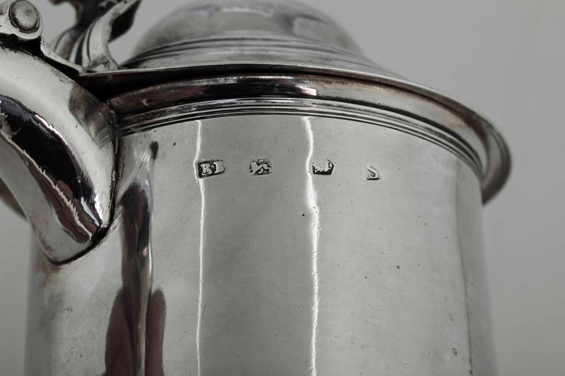 Tankard. Argento fuso, sbalzato e cesellato. Londra 1733. Argentiere R.B. (Richard Bayley?)
