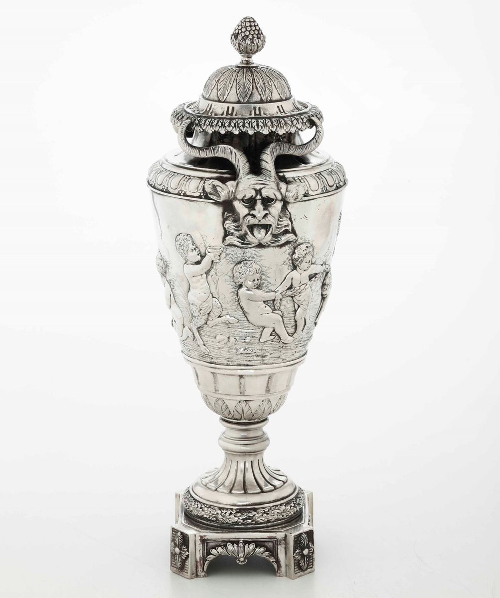Potiche. Argento fuso, sbalzato e cesellato. Manifattura europea del XIX-XX secolo (Hanau?). Marchi ad imitazione dell’argenteria [..]
