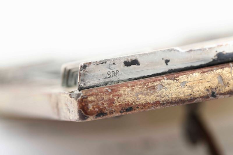 Targa commemorativa. Argento fuso, sbalzato e cesellato. Malachite su tavola in legno dorata, argentiere Stefani Bologna, [..]