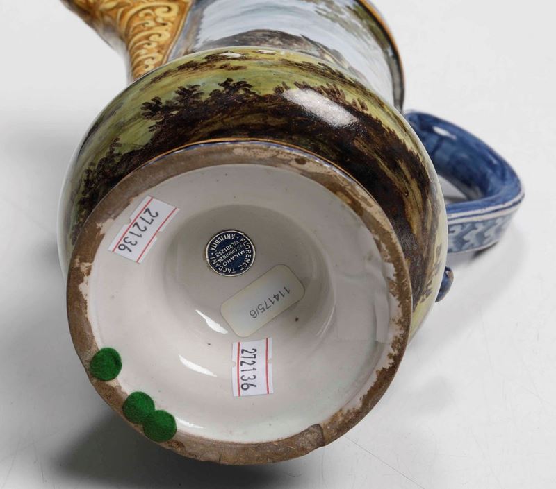 Caffettiera su alto piede, dal corpo cilindrico con largo calice carenato, e alto becco, decorata con una scena pastorale, dai toni severi, derivata da un’incisione di Nicholaes Berchem. Al Museo di San Martino a Napoli ritroviamo la stessa scena campestre. (T. Fittipaldi, Ceramiche: Castelli, Napoli, altre fabbriche, Napoli 1992, p.73, n.51/1) e F.Filipponi, Aurelio Anselmo Grue. La maiolica nel Settecento fra Castelli e Atri, Castelli 2015, p. 117, n. 102