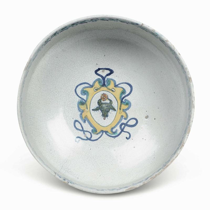 Elegante coppa a parete cilindrica e alto piede svasato. Al centro del cavetto, a campo libero, è dipinto uno stemma con scudo ornato da nastri, mentre all’esterno, sia attorno all’orlo sia alla base del piede, è dipinta una ghirlanda