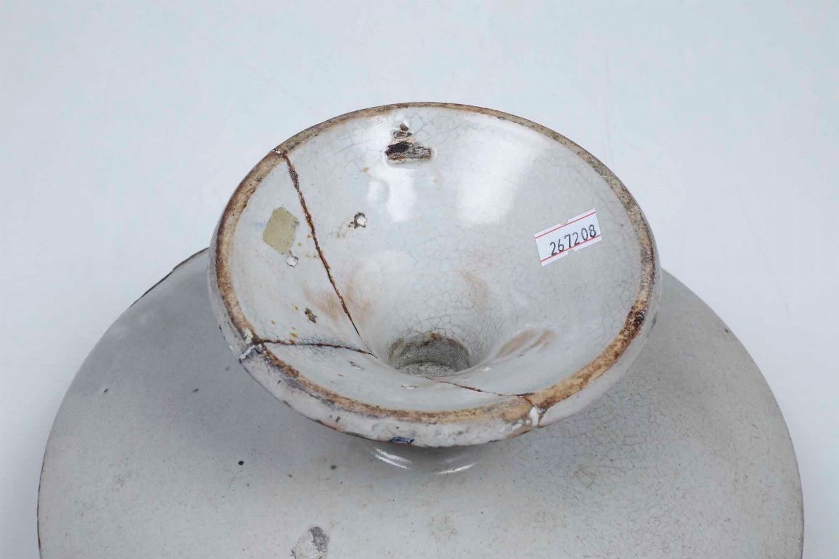 Maiolica decorata in policromia. Marca assente. Dimensioni: altezza cm 19; diametro cm 27. Conservazione: buona; piede con rottura in due frammenti rincollata; insignificanti felature e salti di smalto.