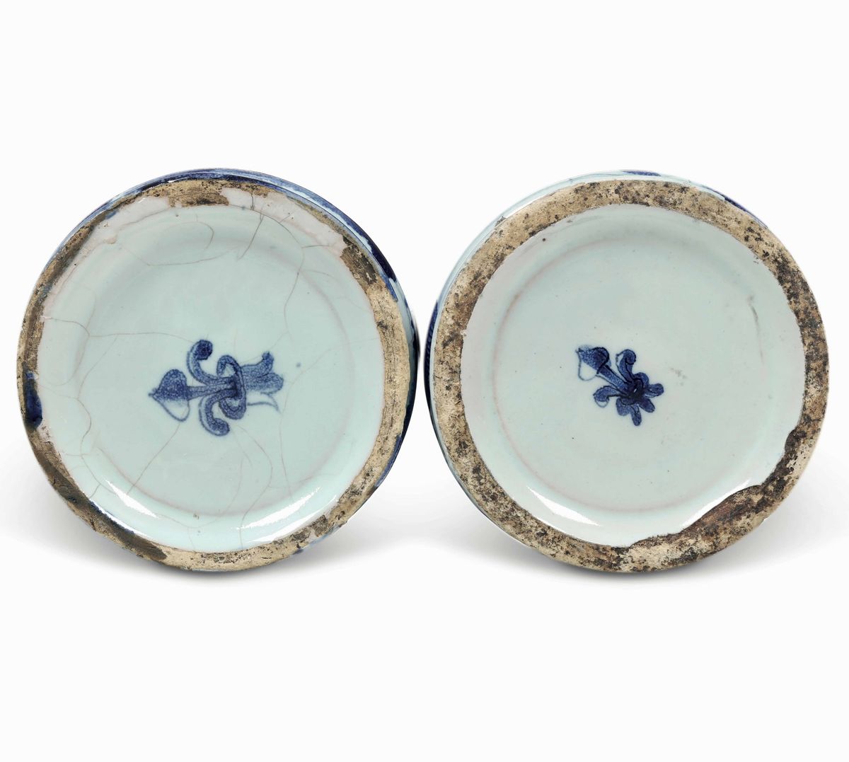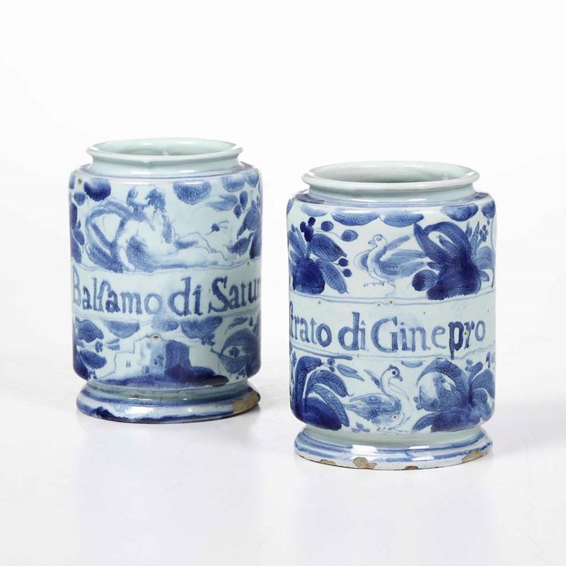 Dall’insolita e rara marca costituita dal giglio, questi albarelli hanno forma cilindrica ed ospitano il cartiglio con la scritta apotecaria in caratteri capitali “Estrato di Ginepro” e “Balsamo di Saturno”. La decorazione in monocromia blu di cobalto è ripresa dalla “tappezzeria” e presenta, tra vegetazione ed edifici, putti e motivi ornitologici