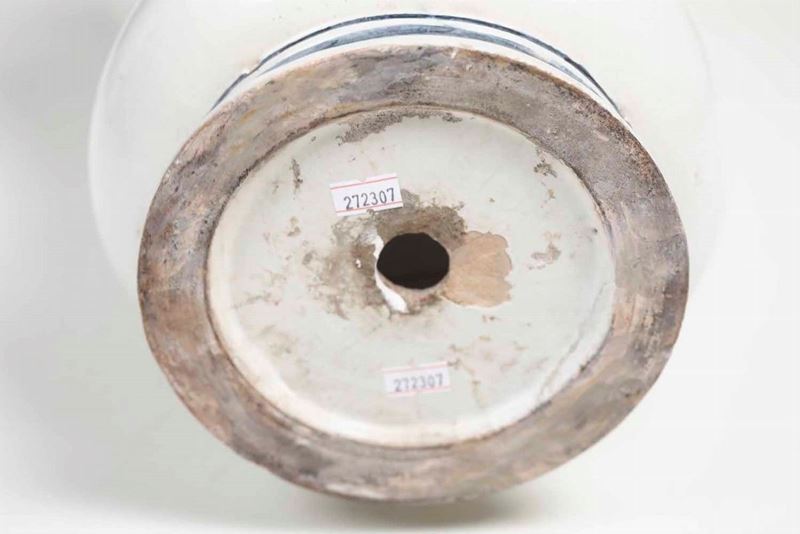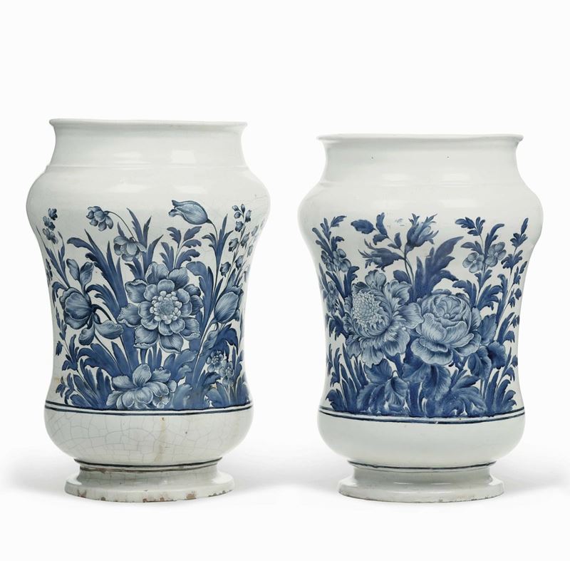 Maiolica decorata in monocromia blu di cobalto. Marca: assente. Altezza cm 37,3 e 39,7. Conservazione: ambedue con foro sul fondo epiccoli restauri ai bordi