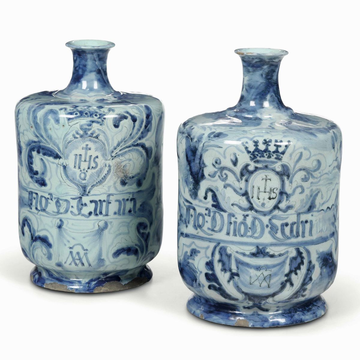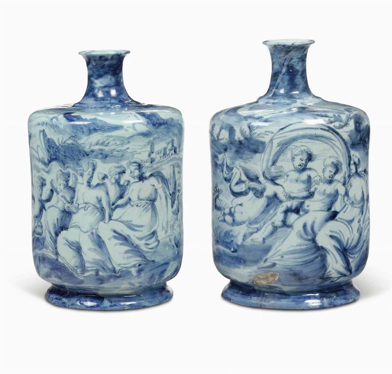 Maiolica a gran fuoco in monocromia blu di cobalto. Marca: stemma di Savona in blu. Altezza cm 30,5; 29,5. Conservazione: ottima; insignificanti sbeccature e cadute di smalto