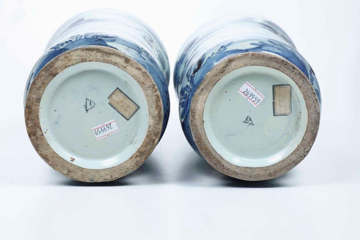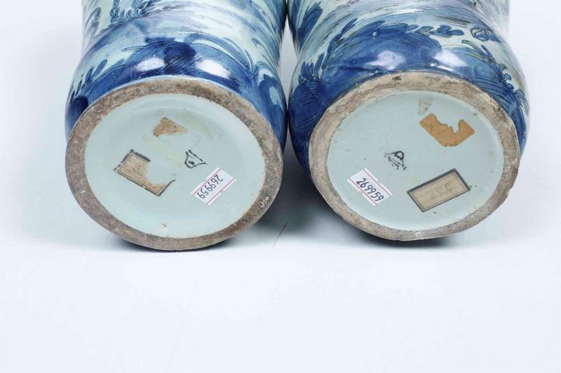 Maiolica. Marca: stemma di Savona in blu. Altezza: cm 27,5; cm 21 circa. Conservazione: piccoli restauri ai bordi; un albarello piccolo con restauro alla spalla, l’altro in diversi frammenti e ricomposto