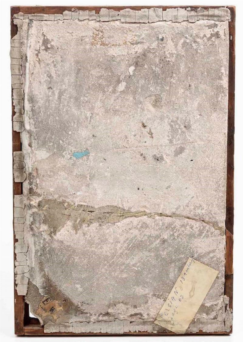 Ceramica dipinta a lustro metallico e blu. Dimensioni: cm 35x22,5 Conservazione: rotta in due frammenti e ricomposta; craquelures Cornice in legno moderna