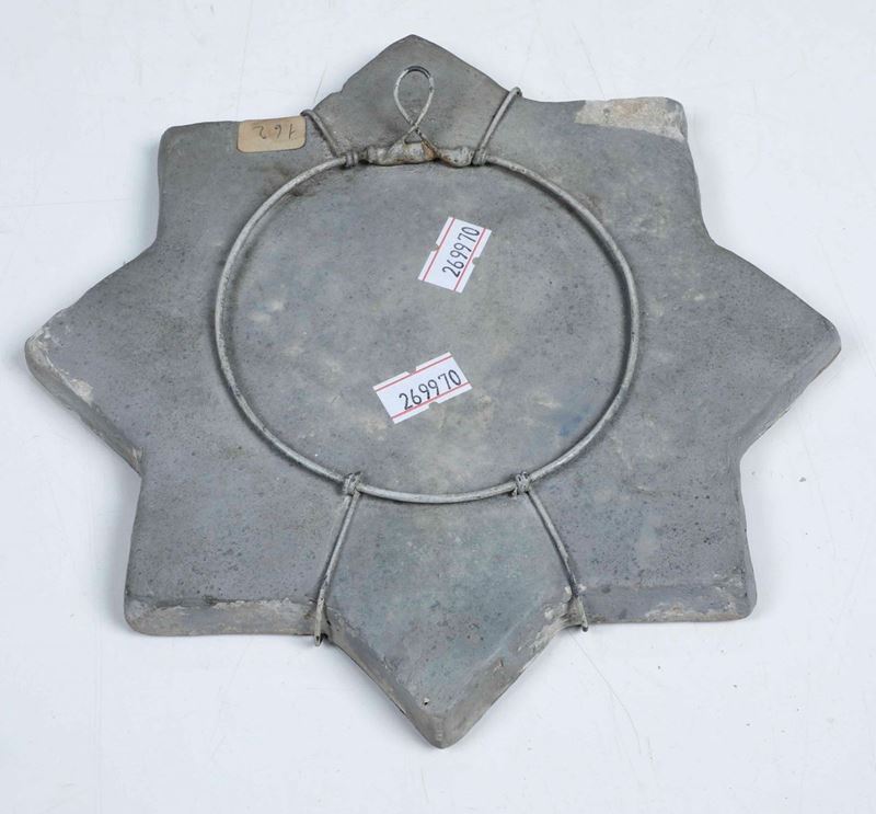 Mattonella a forma di stella a otto punte. Al bordo fascia a motivi geometrici con piccoli rombi, al centro un cervo in corsa tra motivi floreali e un cipresso in primo piano