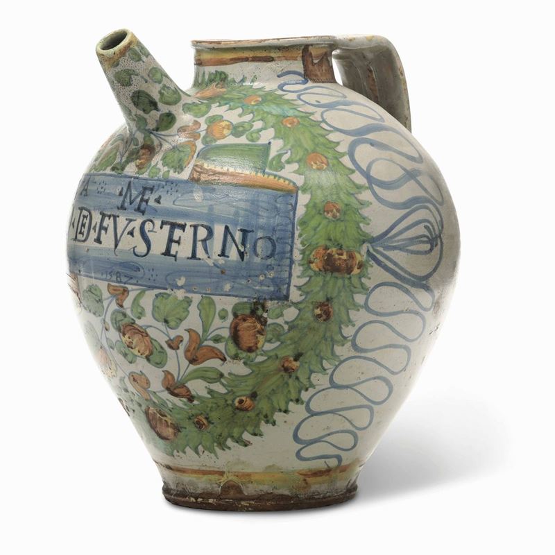 Grande orciolo dipinto in policromia, a gran fuoco, con girali con piccoli frutti e foglie e con ampia fascia apotecaria con “AQ – DE – FU – S – TERNO” sormontata da “VA – ME” e dalla datazione “1587”