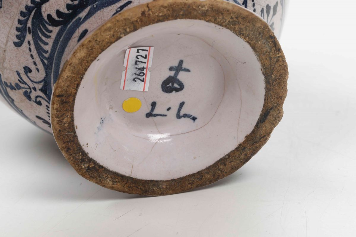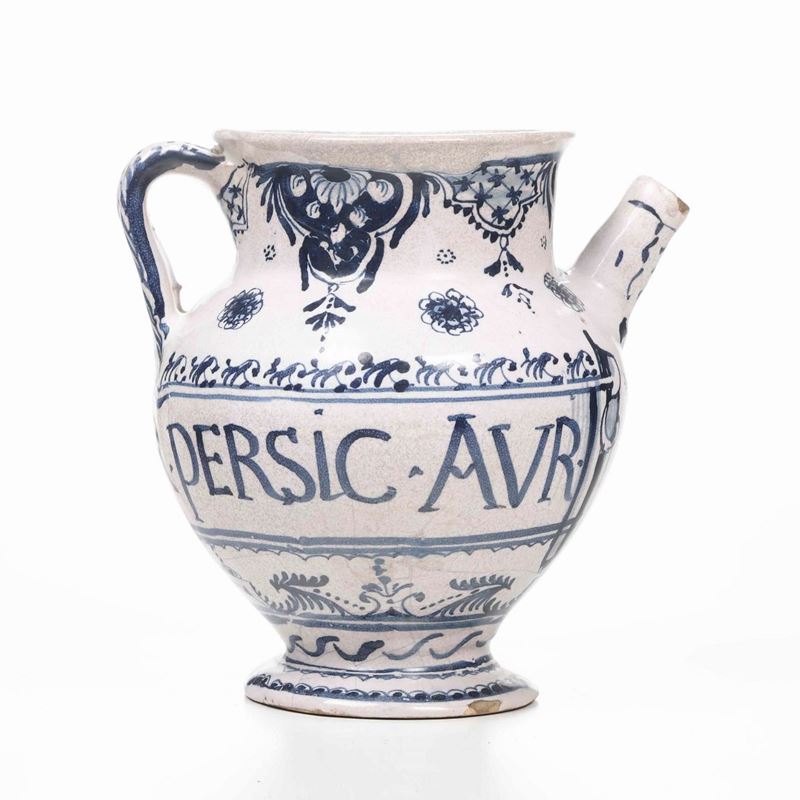 Maiolica. Marca: globo crucifero e “L.L.” in blu. Altezza cm 19,5. Conservazione: piccole sbeccature al bordo inferiore e al beccuccio; insignificanti felature.