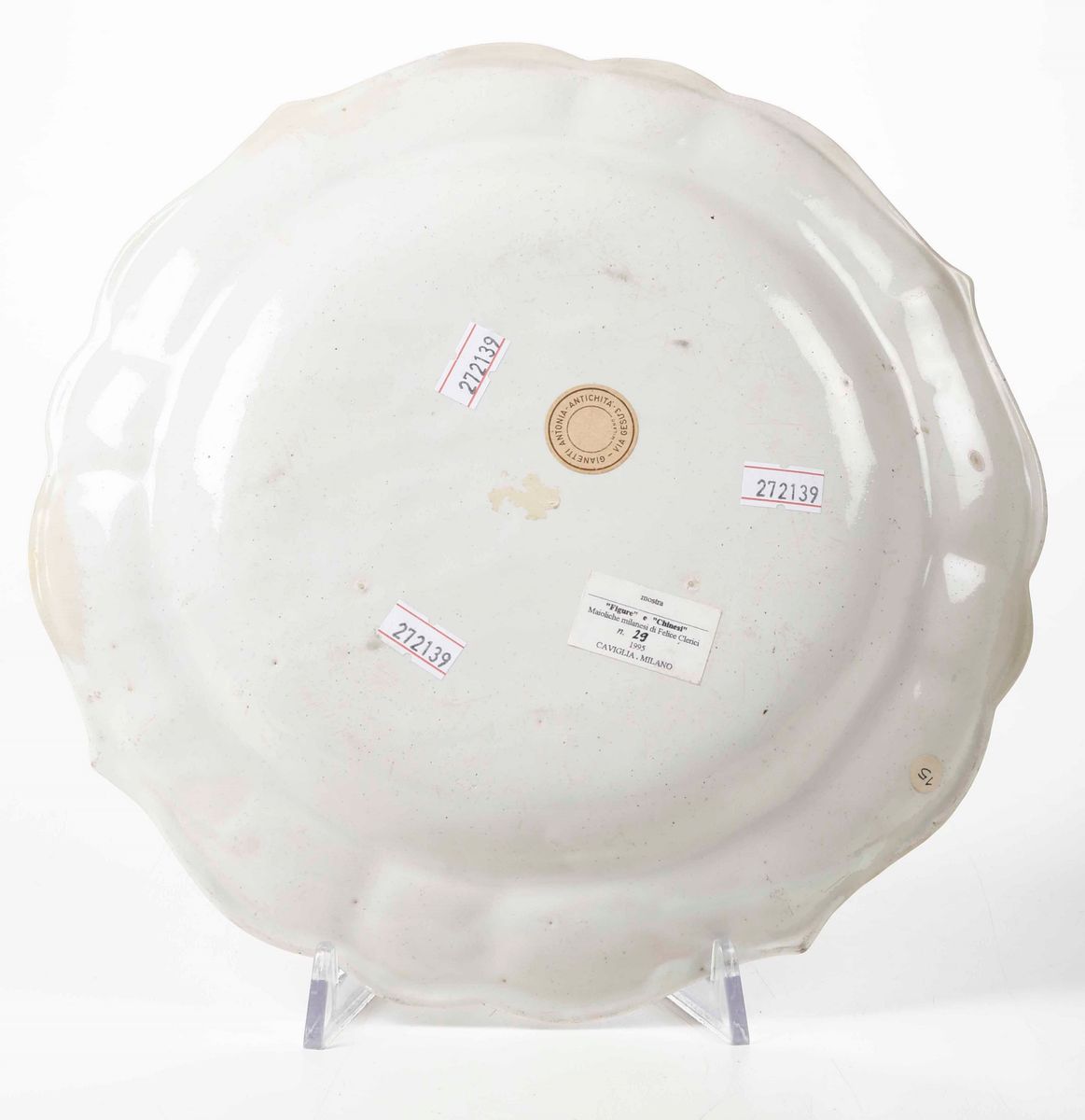 Maiolica decorata con colori a piccolo fuoco. Marca: assente. Diametro cm 26,8. Conservazione: ottima; minime sbeccature al bordo riprese in vecchio restauro