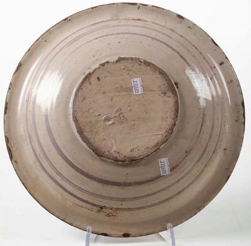 Maiolica. Marca assente. Diametro 31,5. Conservazione: insignificanti cadute di smalto al bordo