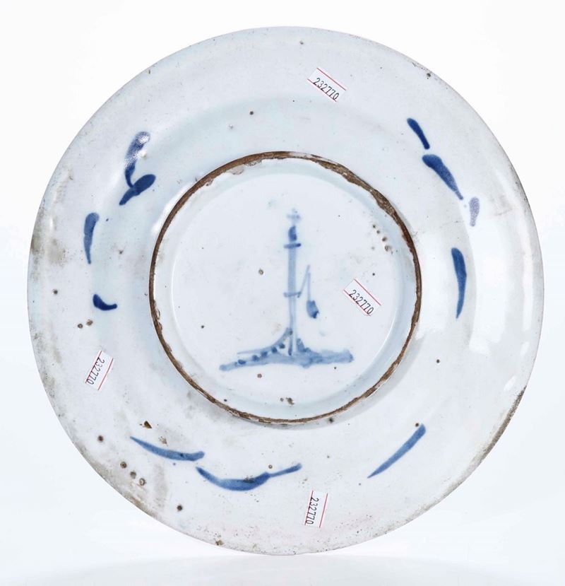 Maiolica. Marca: lanterna in blu. Diametro cm 30. Conservazione: ottima; minima sbeccatura al bordo