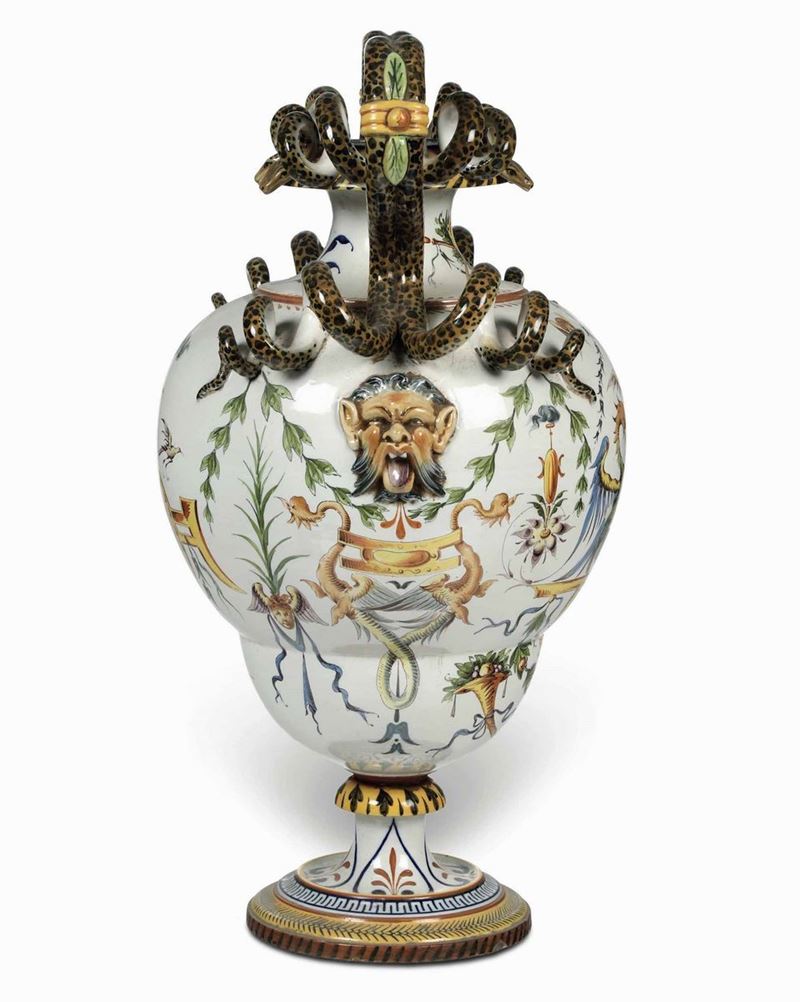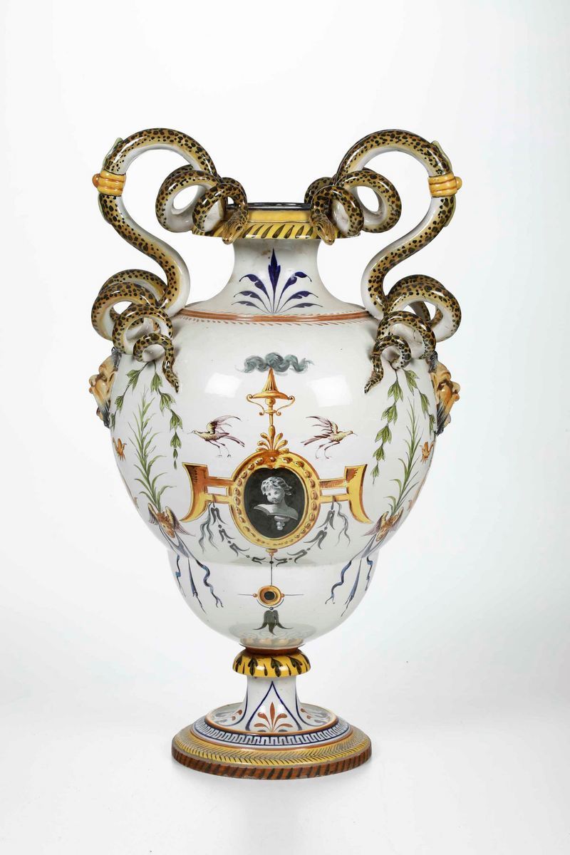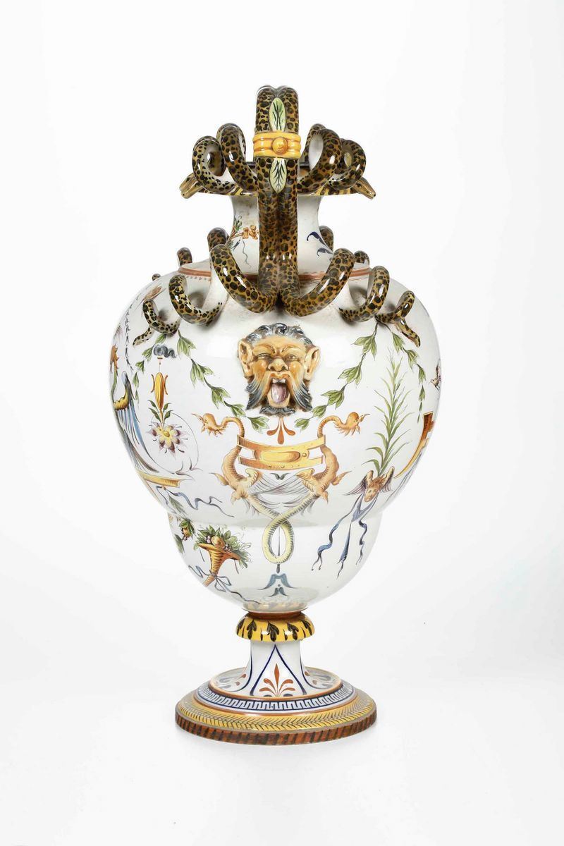 Maiolica dipinta in policromia. Marca: “Ginori” sormontato da corona, in blu; modello 31; decoro 485. Altezza cm 67 . Conservazione: ottima; tre anse dei serpenti rincollate