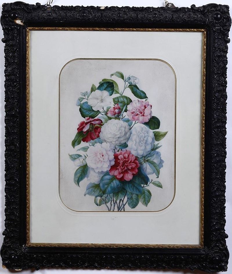 Un disegno e due dipinti ad olio su tavoletta raffiguranti fiori, misure diverse