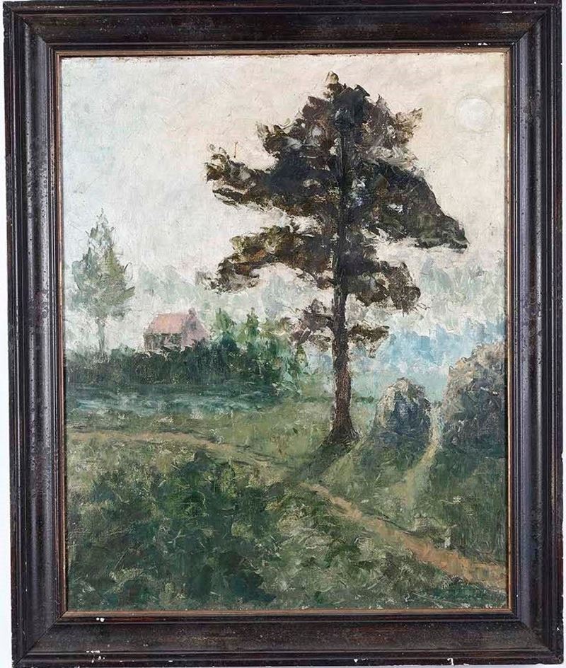 Pittore del XX secolo Paesaggio con albero e casa