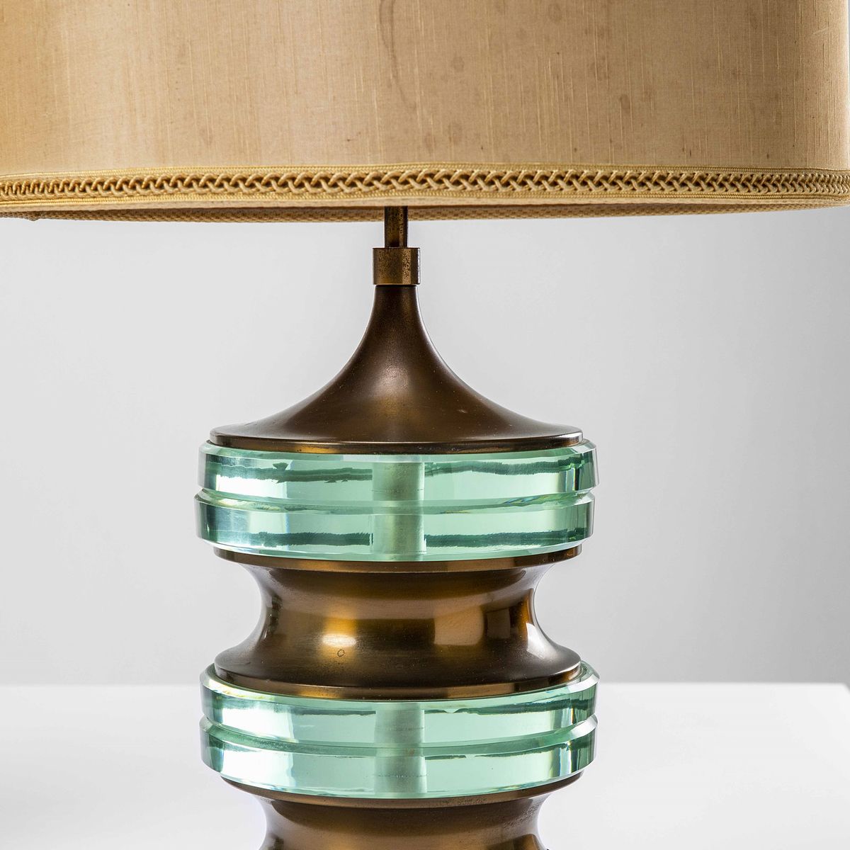 Corpo in ottone e in cristallo molato. Paralume in tessuto. Struttura in metallo e metallo laccato.