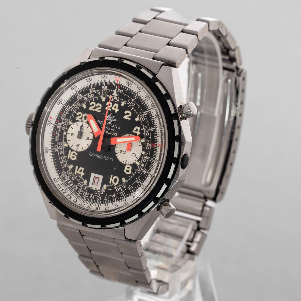 BREITLING - Cosmonaute Chrono-Matic in acciaio con movimento automatico, datario ghiera e rehaut girevoli con indicazione delle 24 ore. quadrante nero con numeri Arabi luminosi