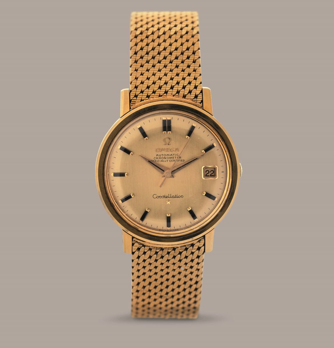 OMEGA - Costellation in oro giallo 18k, quadrante dorato con indici in Onice e datario, bracciale maglia milanese originale con chiusura a scatoletta, carica automatica
