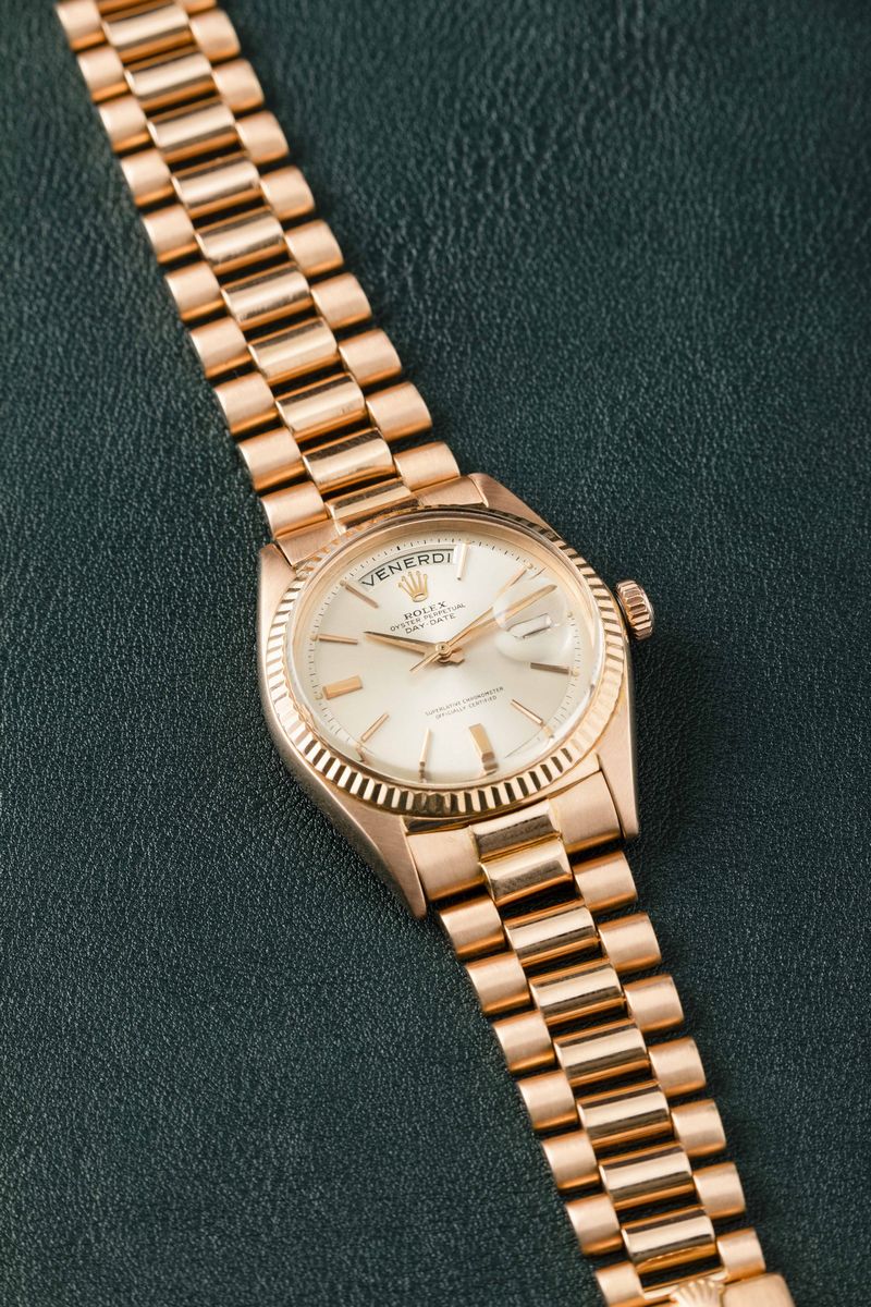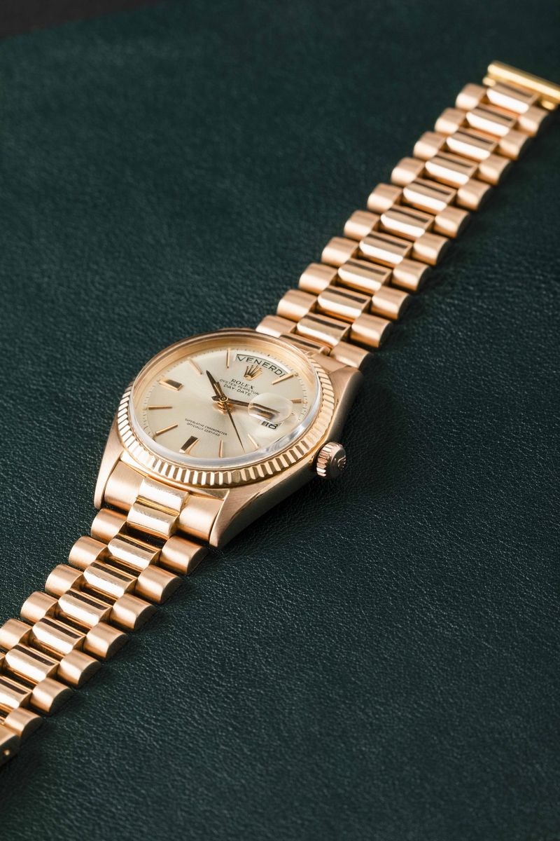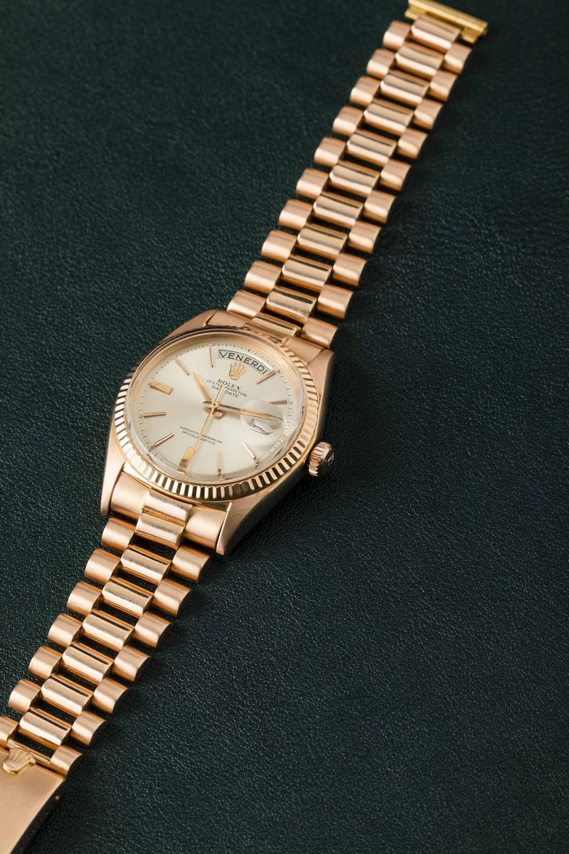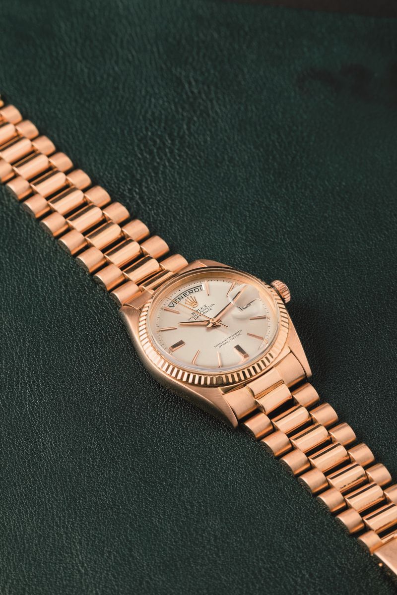 ROLEX - Daydate 1803 in oro Rosa 18k "Step Dial" argentè con indici applicati, ghiera zigrinata, bracciale President con chiusura a scatoletta