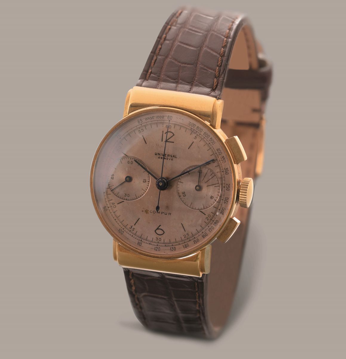 UNIVERSAL GENÈVE - Compur cronografo due contatori in oro 18k tasti quadri, anse coperte, quadrante Salmone movimento carica [..]