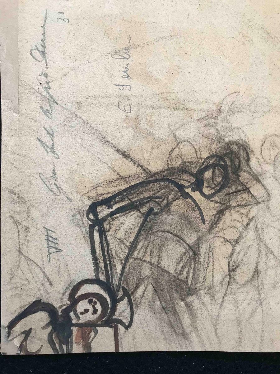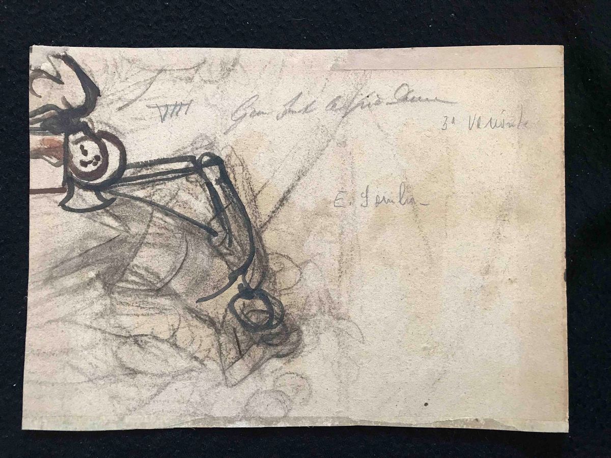 olio su cartoncino. Entro cornice dorata. Iscritto, disegnato e firmato sul retro. Misure: bozzetto cm 26,5 x 19; cornice cm 40,5 x 31,3 . Si tratta di uno dei bozzetti realizzati dal Gamba per gli affreschi della Via Crucis della chiesa di San Gioacchino a Torino