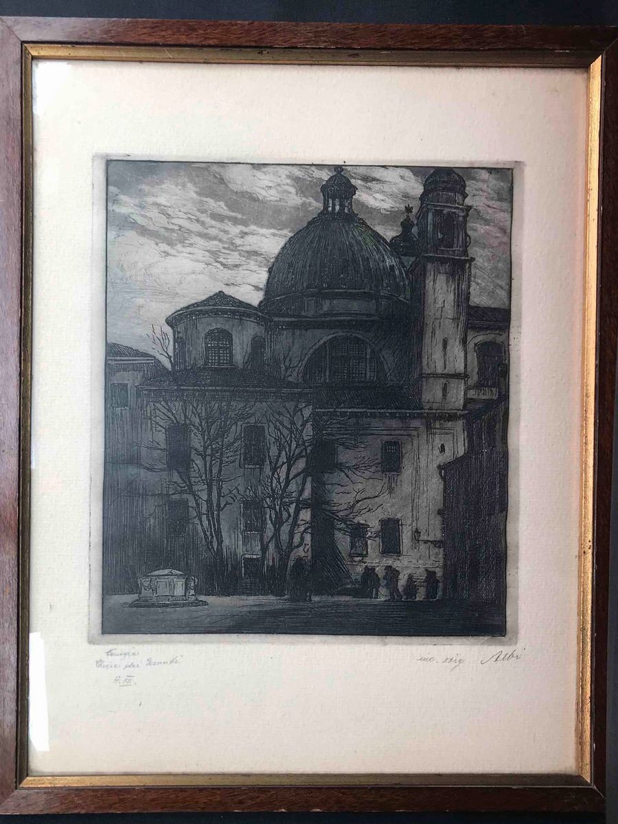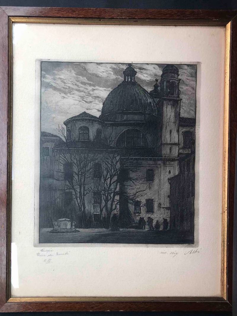 "Isola di San Giorgio" "Chiesa dei Gesuati" “La Salute”. Tutte firmate, titolate e datate A.XII. Misure della lastra cm 24 x 32