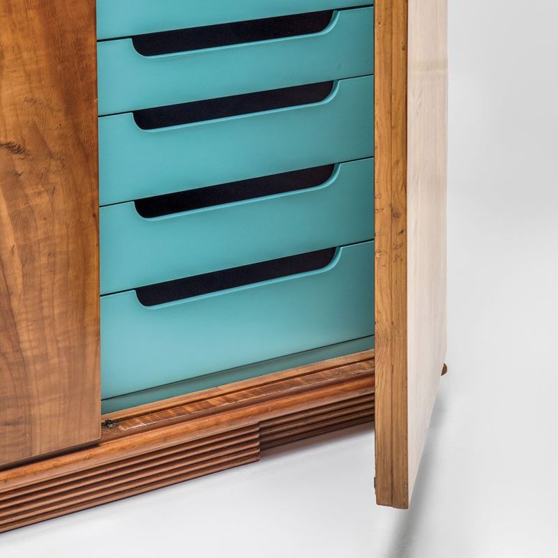Struttura in legno con dettagli in legno lavorato a listelli. Maniglie in fusione di ottone.