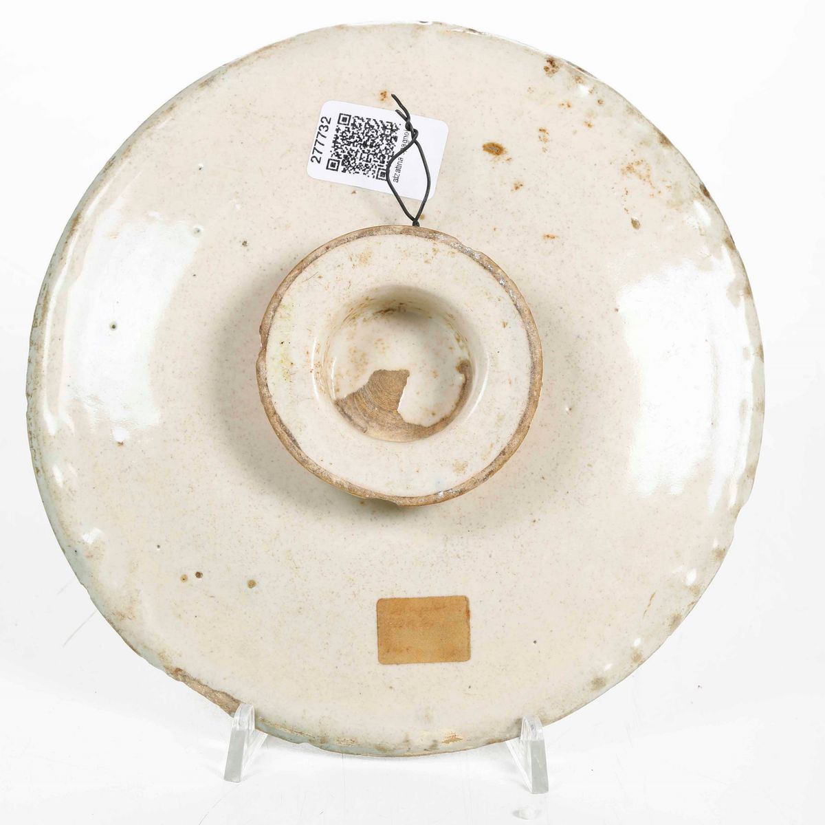 Maiolica Policroma a gran fuoco. Marca: assente. Dimensioni: altezza cm 4,2; diamentro cm 21,8. Conservazione: sbeccature ai bordi