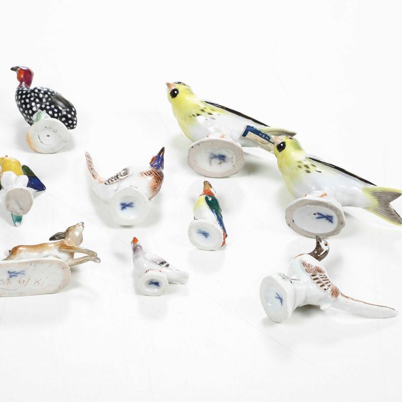 Porcellana. Marca: spade in blu. Altezza massima cm 6. Conservazione: ottima; una coda rincollata; una piccola sbeccatura a un becco