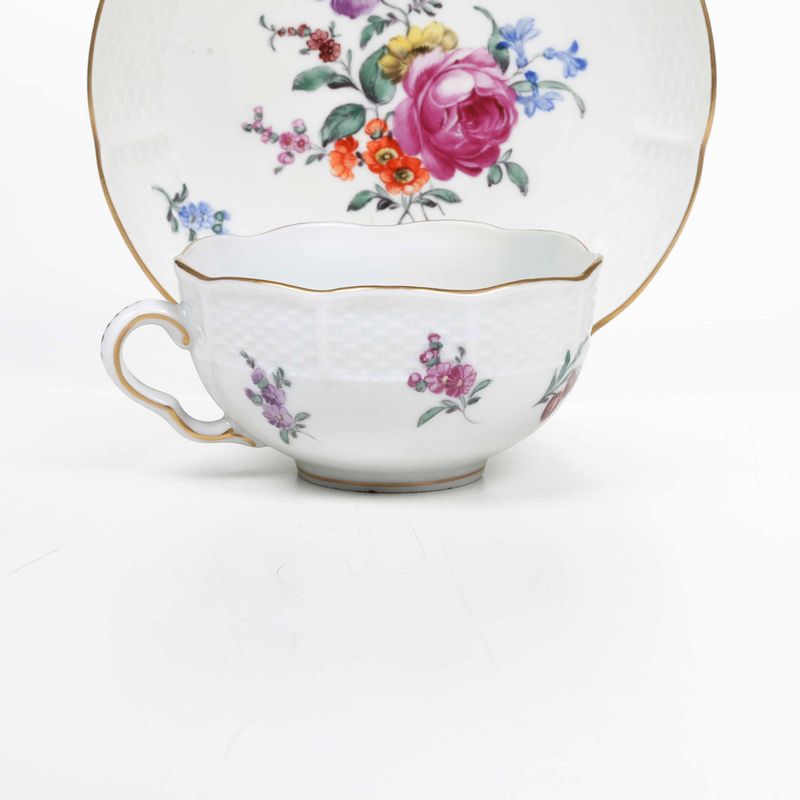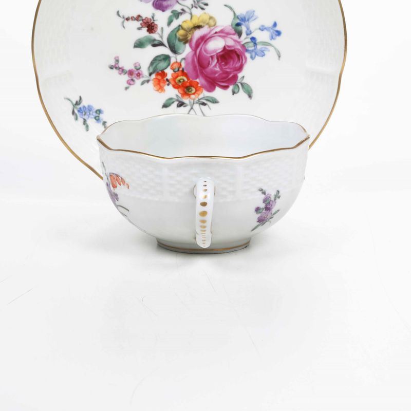 La tazza, dal manico ad orecchio a doppia voluta, ed il piattino ospitano al bordo una fascia a cestello di vimini che confina con gli orli mossi e filettati in oro. Un mazzo di fiori e ramoscelli fioriti e fogliati sparsi spiccano sul bianco della superficie