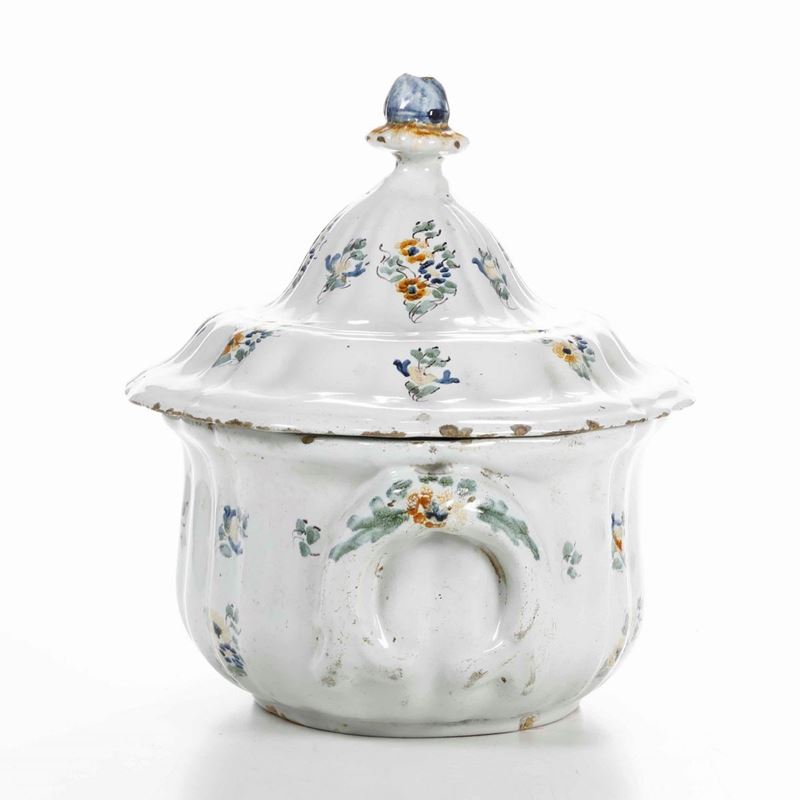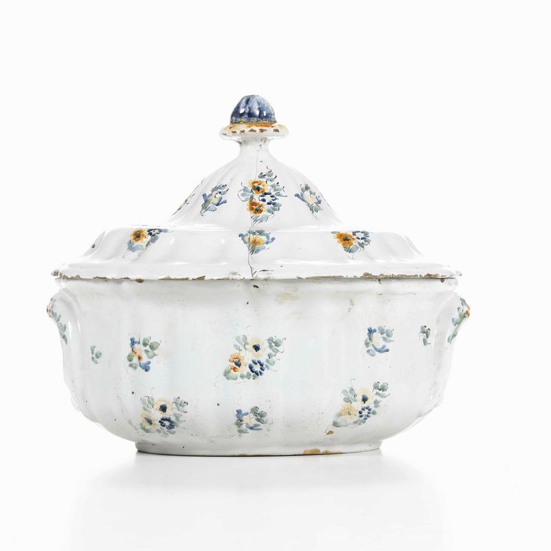 Maiolica. Marca: assente. Altezza cm 25,5; cm 31x23 Conservazione: felature al coperchio; insignificanti sbeccature