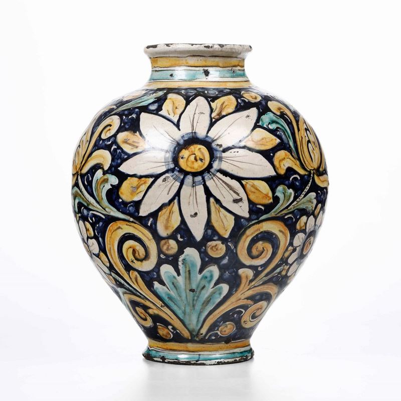 Maiolica decorata in policromia a gran fuoco. Altezza cm 36,5. Conservazione: ottima; minime usure e sbeccature