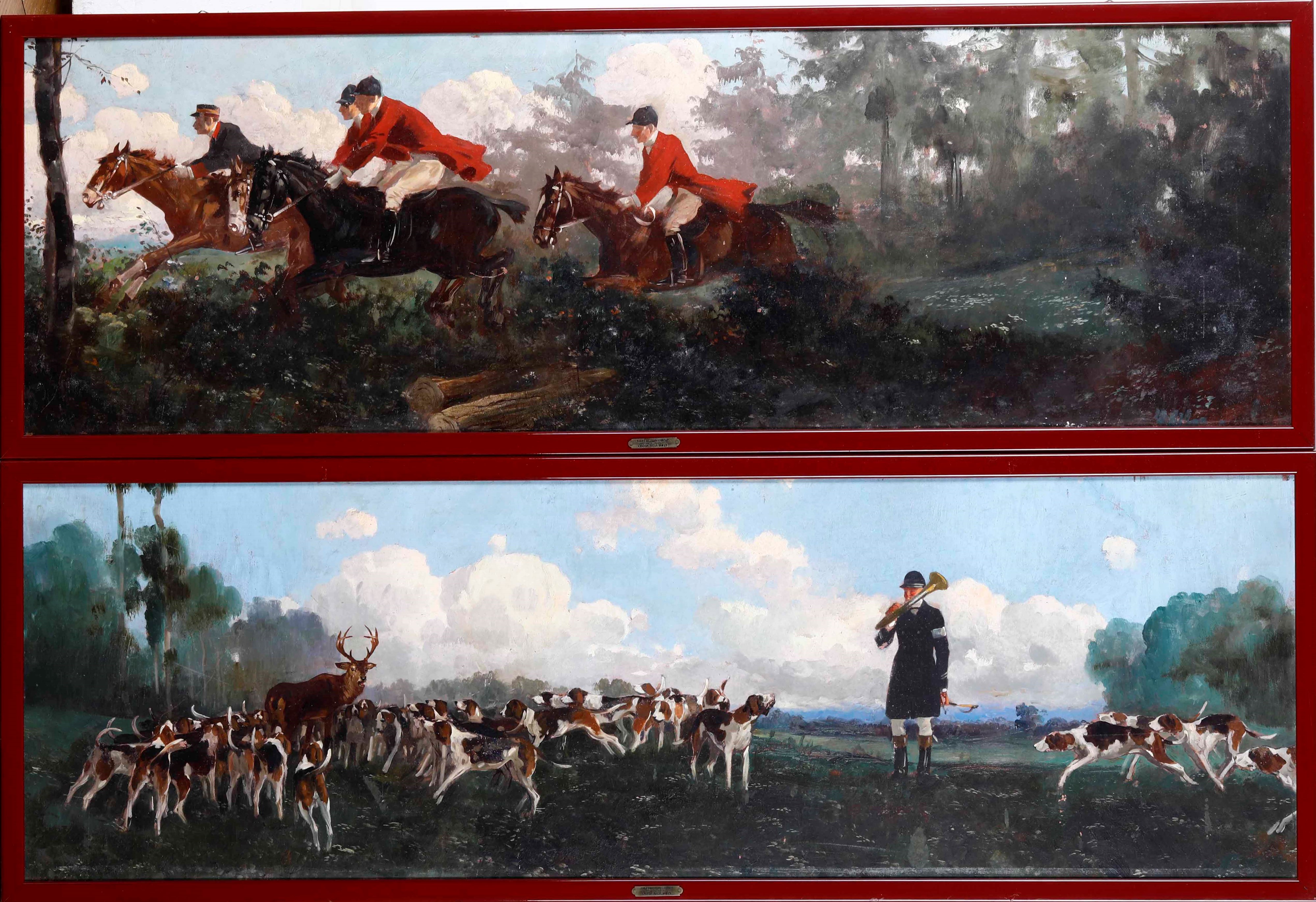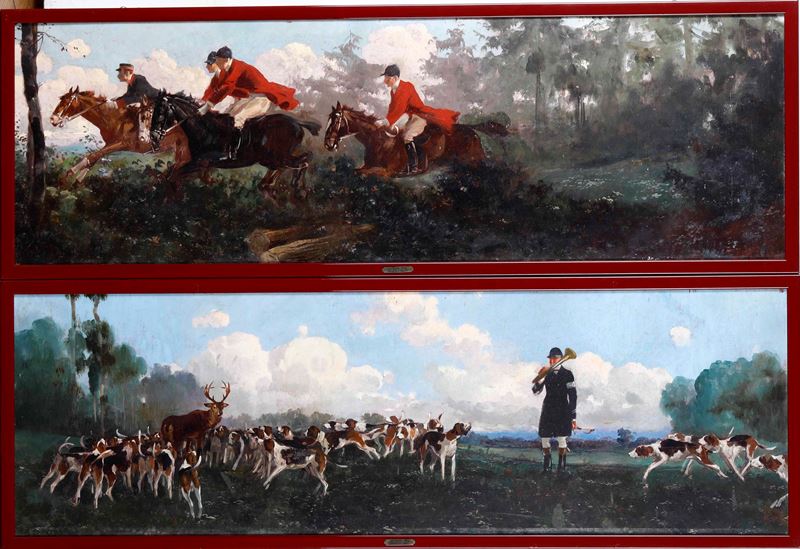 tre pannelli ad olio su tavola, due cm 126x40 e uno cm 92x40.