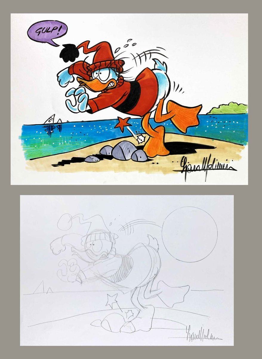 Illustrazione originale matita, china ed ecoline; cm 24x33. Accompagnata da preliminare lapis su carta; cm 21x30. Non datate ma 2020 circa. Entrambe firmate. Ottimo stato.