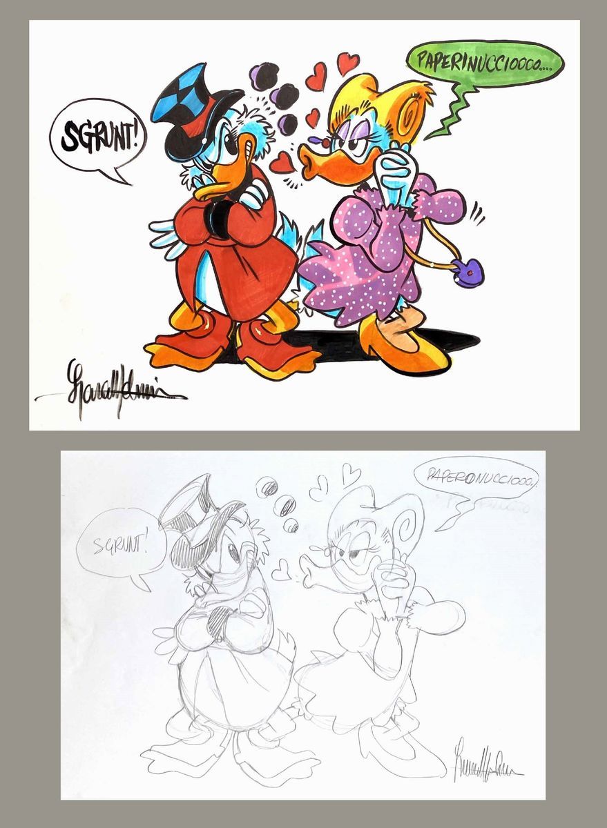 Illustrazione originale matita, china ed ecoline; cm 24x33. Accompagnata da preliminare lapis su carta; cm 21x30. Non datate ma 2020 circa. Entrambe firmate. Ottimo stato.