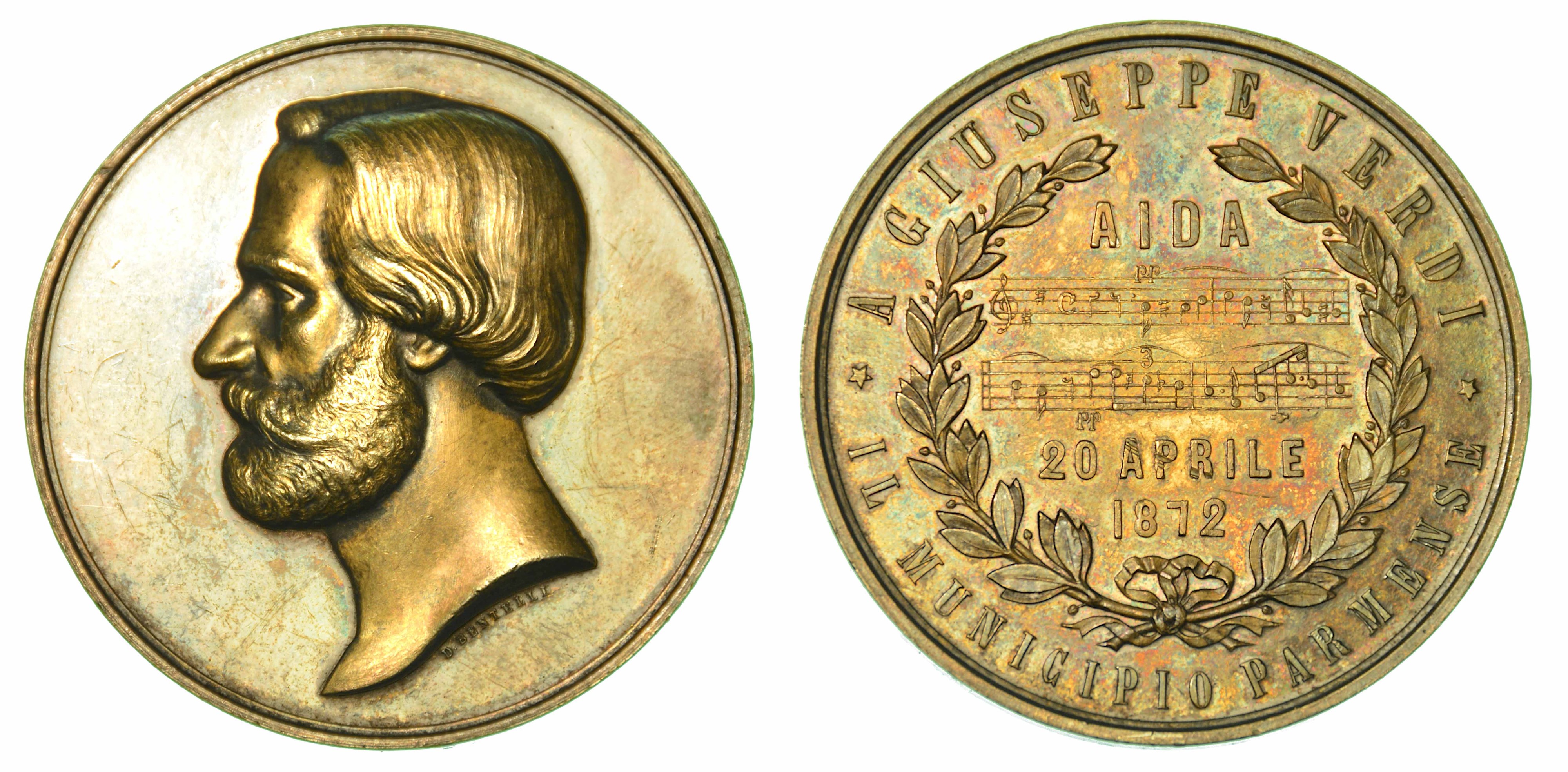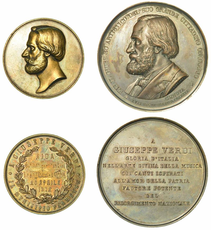 A GIUSEPPE VERDI IL MUNICIPIO PARMENSE. Medaglia in argento 1872. Testa del musicista a s. R/ Spartito dell'Opera Aida tra due rami di alloro. Opus D. Bentelli. g. 62,15. Diam. mm. 50,52. SPL/FDC (lieve doratura; con astuccio d'epoca) - A GIUSEPPE VERDI LA CITTA' DI GENOVA. Medaglia in bronzo 1889. Busto del musicista a s. R/ Legenda in nove righe. Opus Speranza. g. 145,10. Diam. mm. 68,48. SPL (lievi segni di contatto sui bordi; con astuccio originale con stemma genovese)