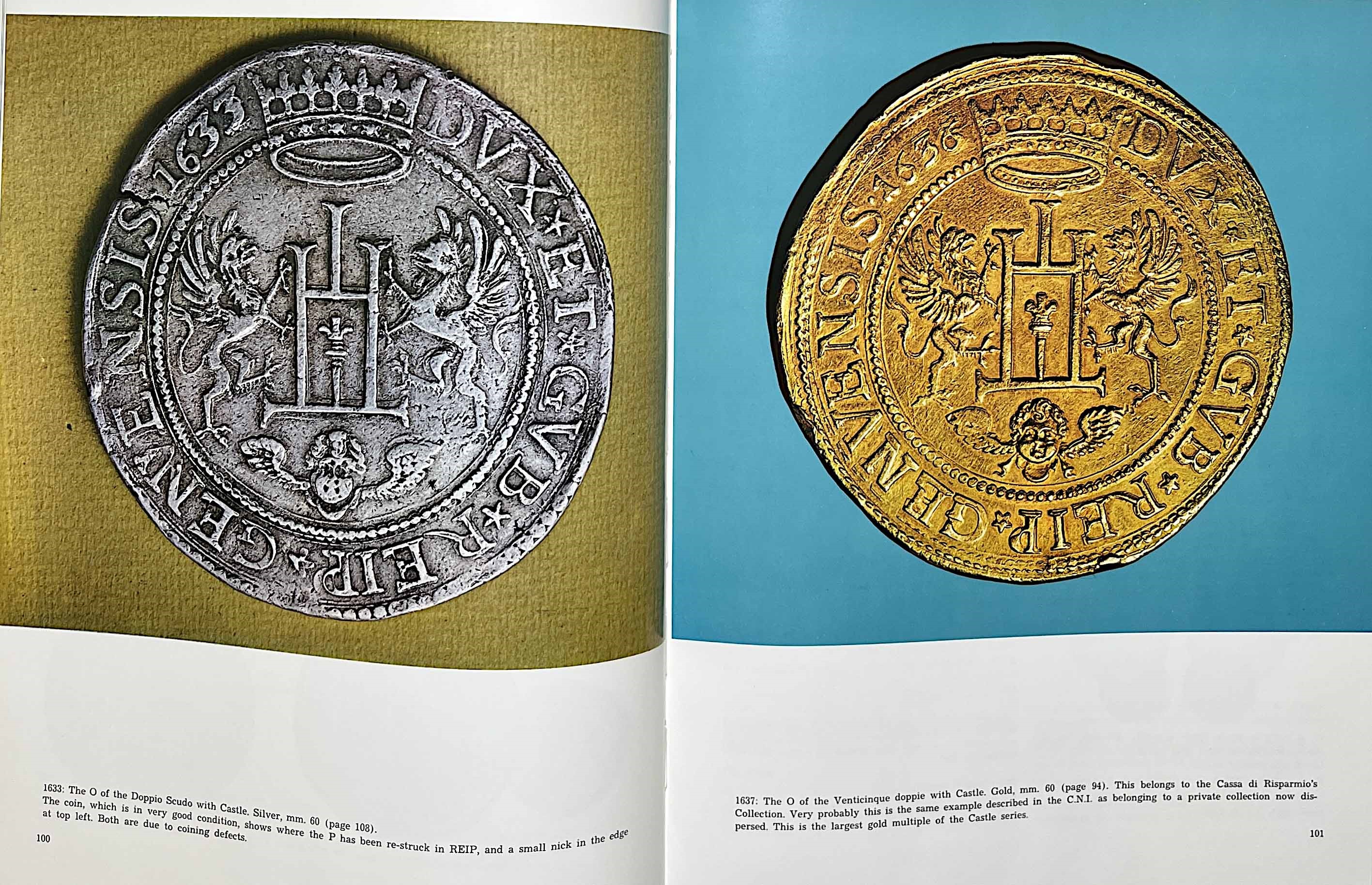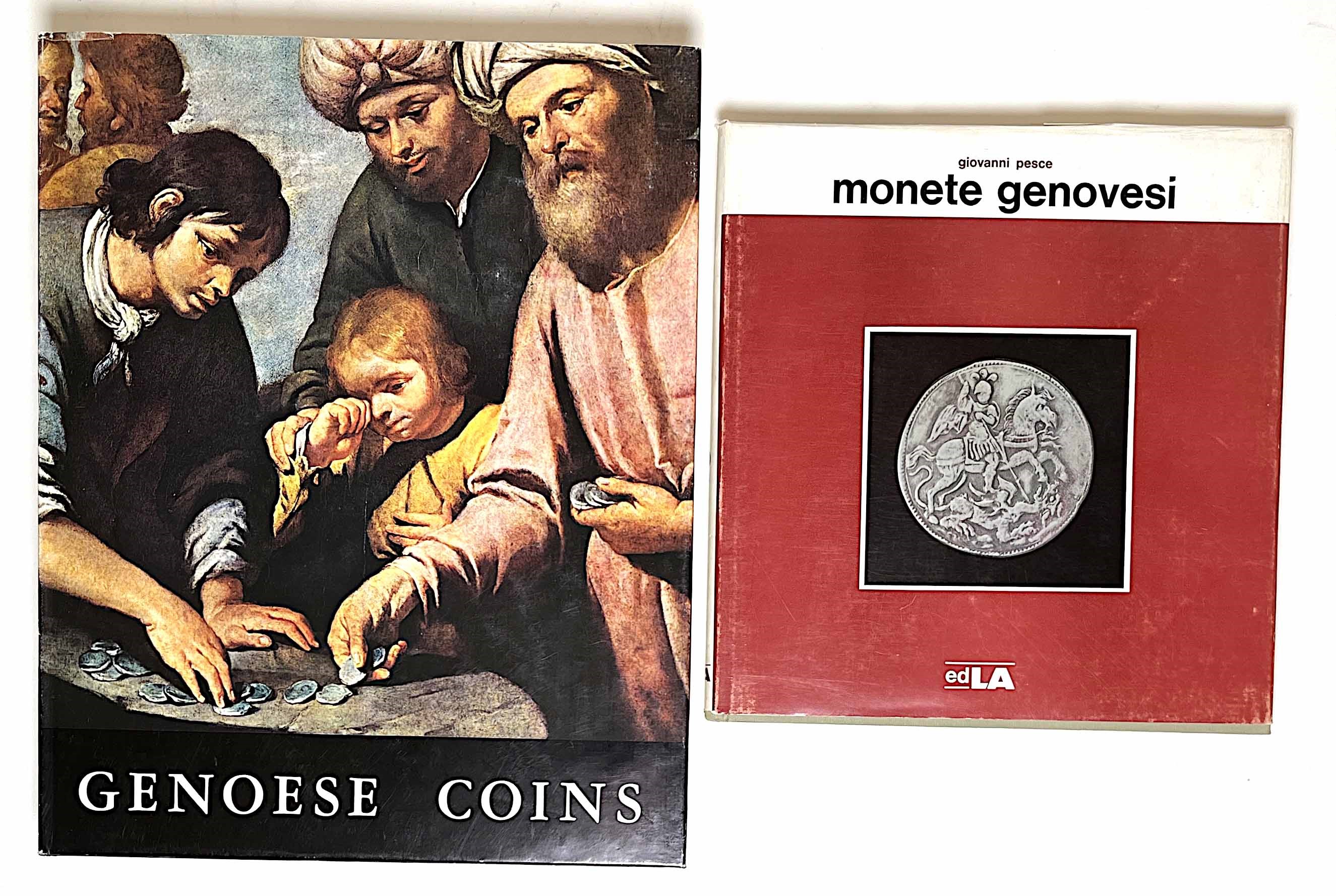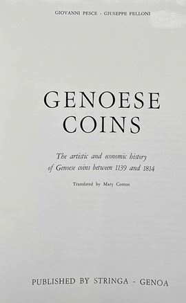 PESCE G. - FELLONI G. Le monete genovesi. Storia, arte ed economia nelle monete di Genova dal 1139 al 1814. Genova, 1975. pp. 379, con molte bellissime illustrazioni, anche a colori. Formato in 4° circa cm. 26x33. Rilegatura editoriale in tela con sovracoperta. Condizioni molto buone. - PESCE G. Monete genovesi 1139 – 1814. Milano, 1963. pp. 156. tavv. 28 + ill. nel testo. Formato in 8° circa cm. 23x25. Rilegatura editoriale. Condizioni molto buone.