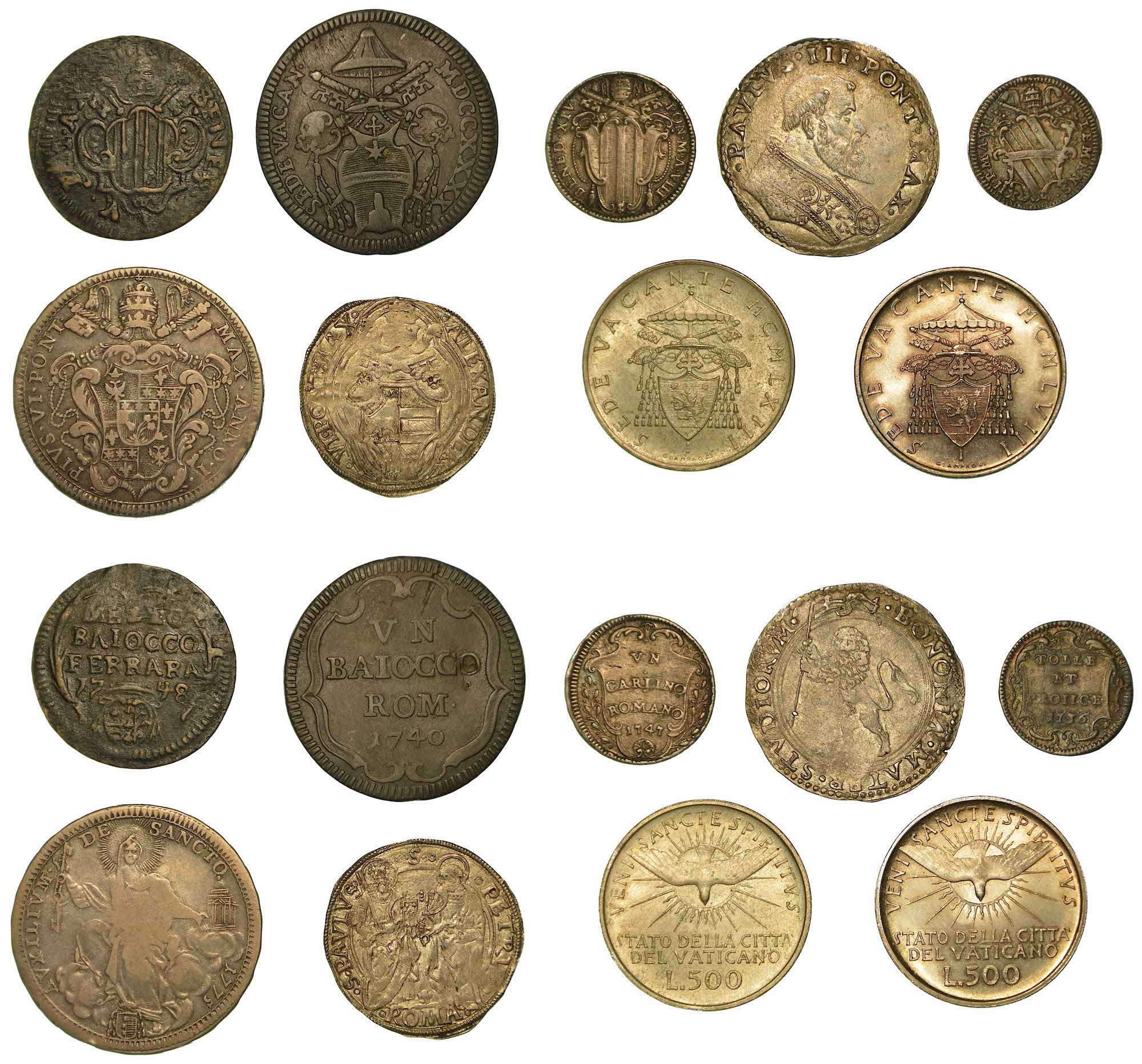 ALESSANDRO VI, 1492-1503. Grosso. PAOLO III, 1534-1549. Bianco (Bologna). CLEMENTE XII, 1730-1740. Grosso 1736. SEDE VACANTE, 1740. Baiocco 1740. BENEDETTO XIV, 1740-1758. Carlino 1747 - Mezzo Baiocco 1748 (Ferrara). PIO VI, 1775-1799. Mezzo Scudo 1775. SEDE VACANTE, 1958. 500 Lire 1958. SEDE VACANTE, 1963. 500 Lire 1963. Argento e rame. Conservazioni da B/MB a q.FDC.