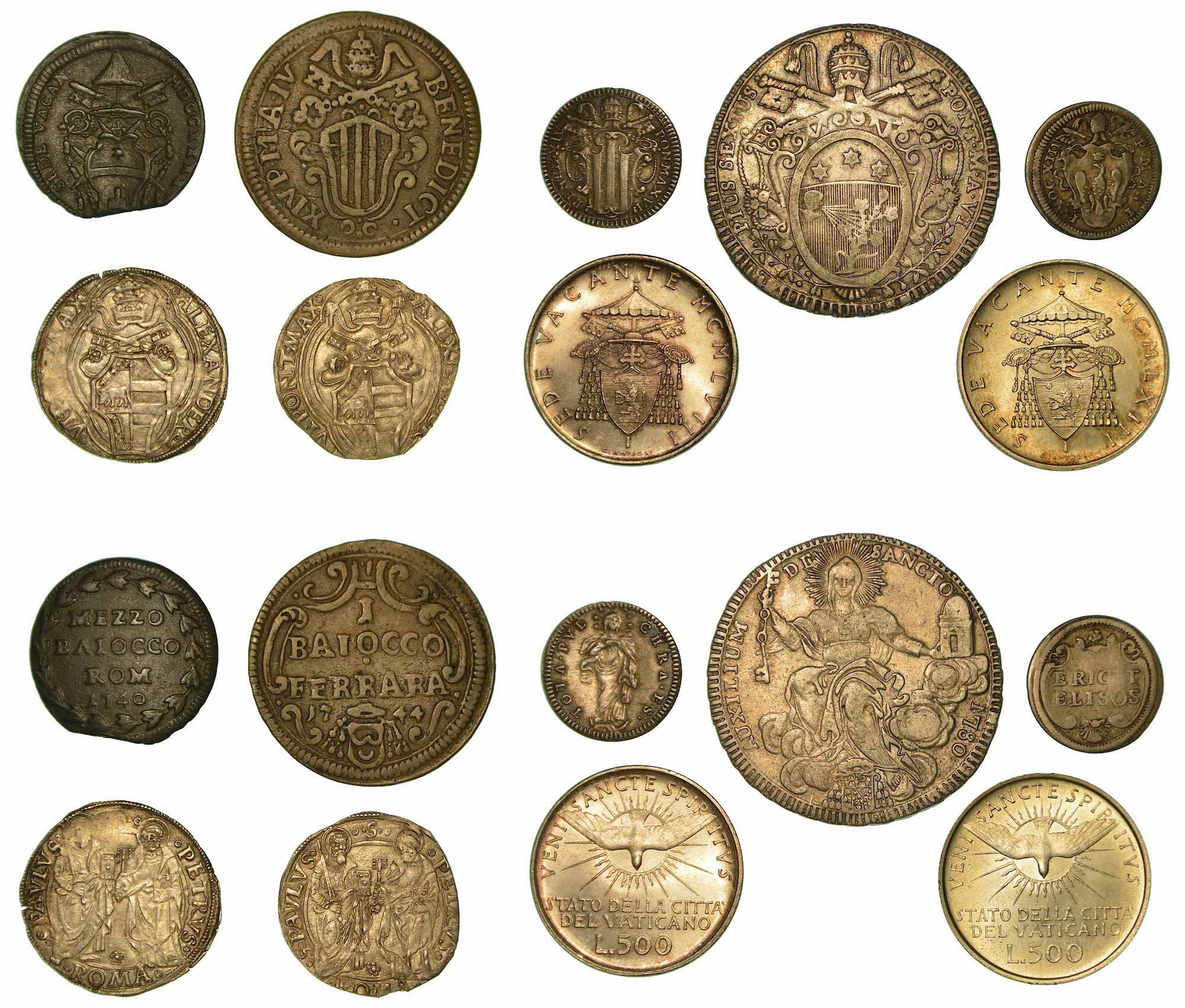 ALESSANDRO VI, 1492-1503 (2 esemplari). INNOCENZO XIII, 1721-1724. Grosso A. I. SEDE VACANTE, 1740. Mezzo Baiocco 1740. BENEDETTO XIV, 1740-1758. Grosso A. XVI - Baiocco 1744 (Ferrara). PIO VI, 1775-1799. Scudo 1780. SEDE VACANTE, 1958. 500 Lire 1958. SEDE VACANTE, 1963. 500 Lire 1963. Argento e rame. Conservazioni da MB a q.FDC.