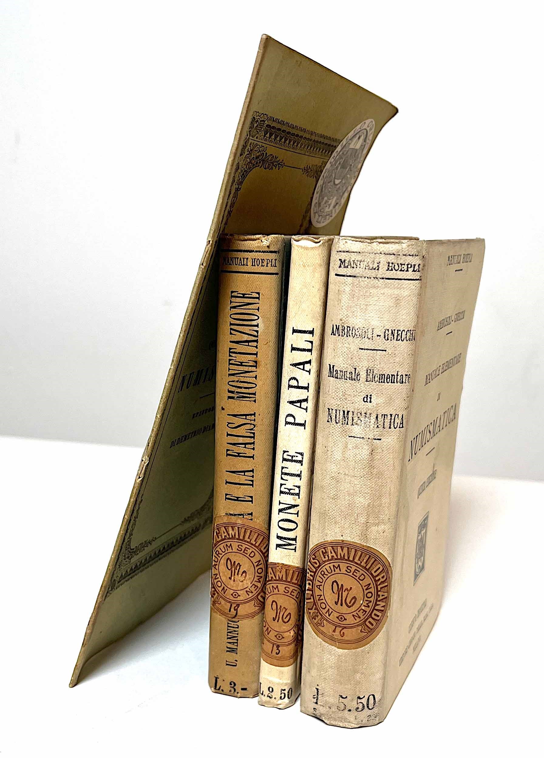 AMBROSOLI S. Atlantino di monete papali moderne a sussidio del Cinagli. Milano, 1905. pp. 131 + indici + sezione “Manuali pei numismatici” - AMBROSOLI-GNECCHI. Manuale elementare di numismatica. Quinta edizione. Milano, 1915. pp. 232 + indici. tavv. 40 - MANNUCCI U. La moneta e la falsa monetazione. Milano, 1908. pp. 271 + indici + elenco manuali Hoepli. DIAMILLA D. Risposta a quattro quesiti numismatici. Roma, 1847. pp. 18. Brossura. Circa cm. 21x14. Se non altrimenti specificato, esemplari rilegati in tela, circa cm. 15x11. Buone condizioni.