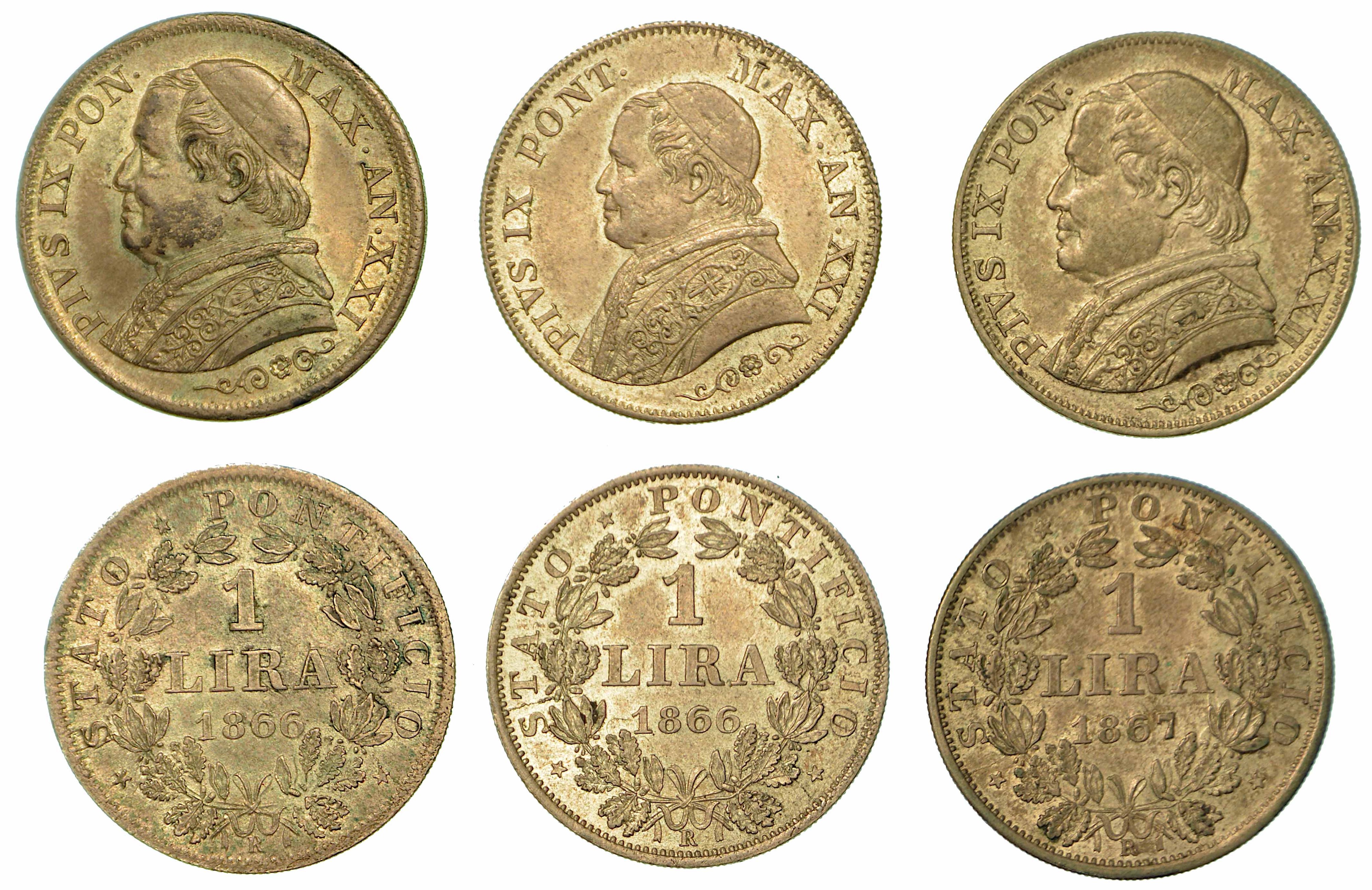 PIO IX (Giovanni Maria Mastai Ferretti), 1846-1878. Lira 1866/A. XXI (tipo testa piccola). Gig. 295. g. 4,97. Diam. mm. 23,24. Arg. SPL - Lira 1866/A. XXI. Gig. 297. g. 4,98. Diam. mm. 23,52. Arg. BB/q.SPL (tipo testa grande) - Lira 1867/A. XXII. Gig. 299. g. 4,96. Diam. mm. 23,35. Arg. BB/q.SPL