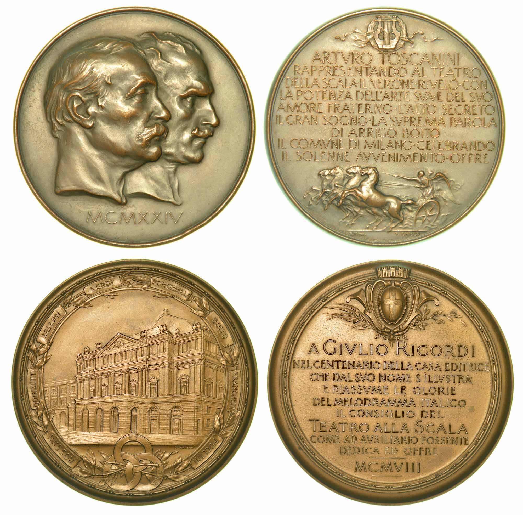 MILANO. IL CONSIGLIO DEL TEATRO ALLA SCALA A GIULIO RICORDI. Medaglia in bronzo 1908. Veduta prospettica della facciata del Teatro. Intorno, nastro con le targhe dei maggiori compositori. R/ Legenda e data in dieci righe sotto lo stemma di Milano. Opus Stabilimento Johnson. g. 90,08. Diam. mm. 61,48. SPL/FDC - IL COMUNE DI MILANO AD ARTURO TOSCANINI. Medaglia in bronzo 1924. Testa accollate a d. di Arturo Toscanini e Arrigo Boito. R/ Legenda in nove righe tra lira e quadriga. g. 87,58. Diam. mm. 60,56. q.SPL