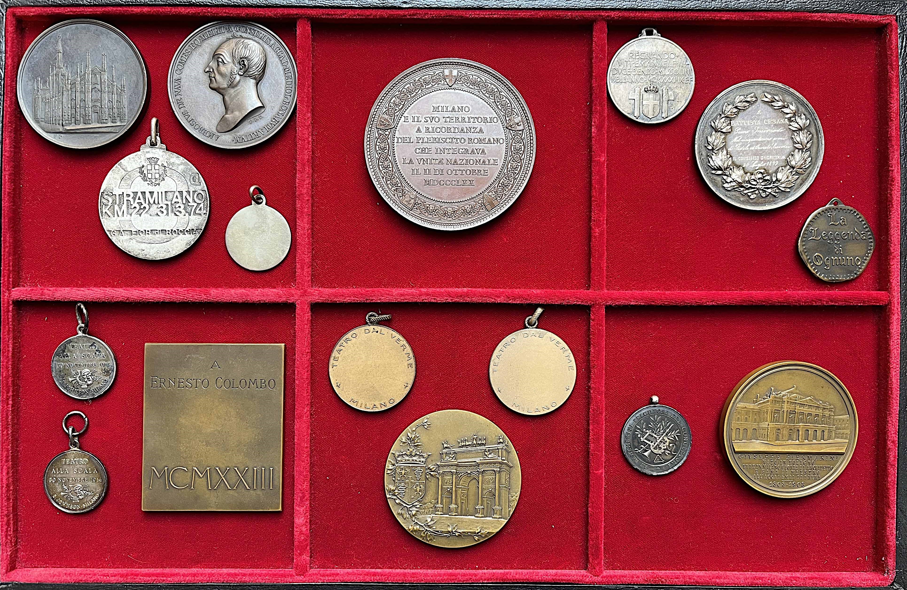 Esemplari raffiguranti monumenti e luoghi caratteristici della città di Milano, fra i quali si segnalano: Teatro alla Scala, Stazione Centrale, Pinacoteca di Brera e Duomo. Bronzo e altri metalli. Conservazioni buone.
