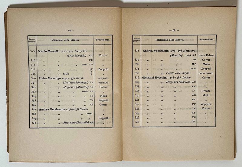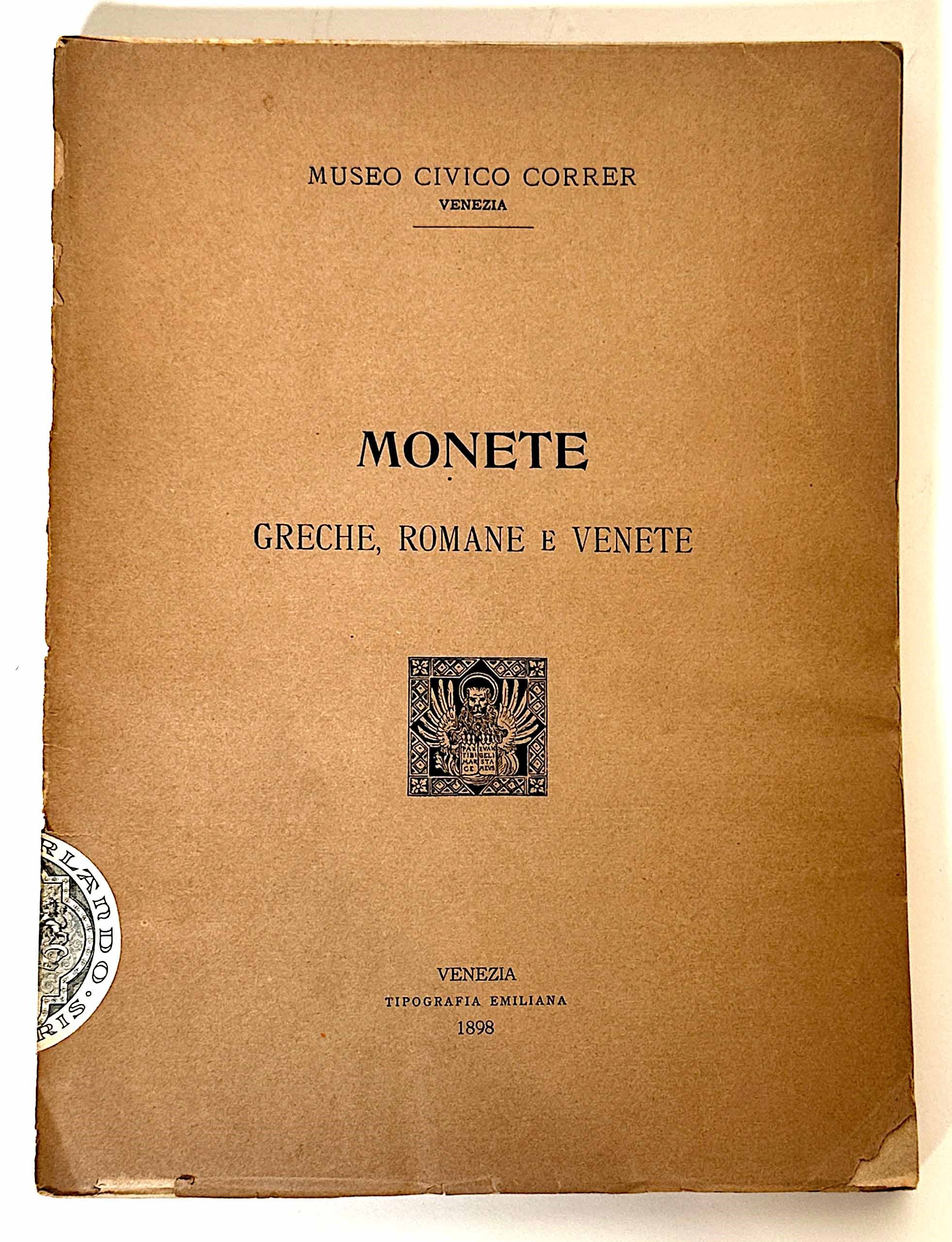 Venezia, 1898. pp. 249 di tabelle elencanti le monete conservate al Museo con tutti i nominativi del Collezionisti venditori o donatori. Non illustrato. Formato in 12° circa cm. 17x23. Condizioni interne buone; copertina strappata.
