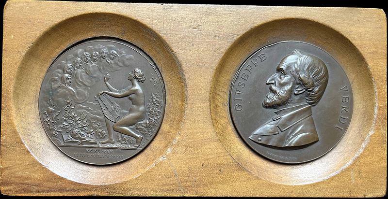 Sono raffigurati importanti esponenti della lirica e del teatro italiano, fra i quali si segnalano: ARTURO TOSCANINI; GIOACCHINO ROSSINI; GIUSEPPE GIACOSA; GIUSEPPE VERDI; MARCELLO VISCONTI DI MODRONE; MARCO PRAGA. Esemplari in bronzo e altri metalli. Conservazioni buone.