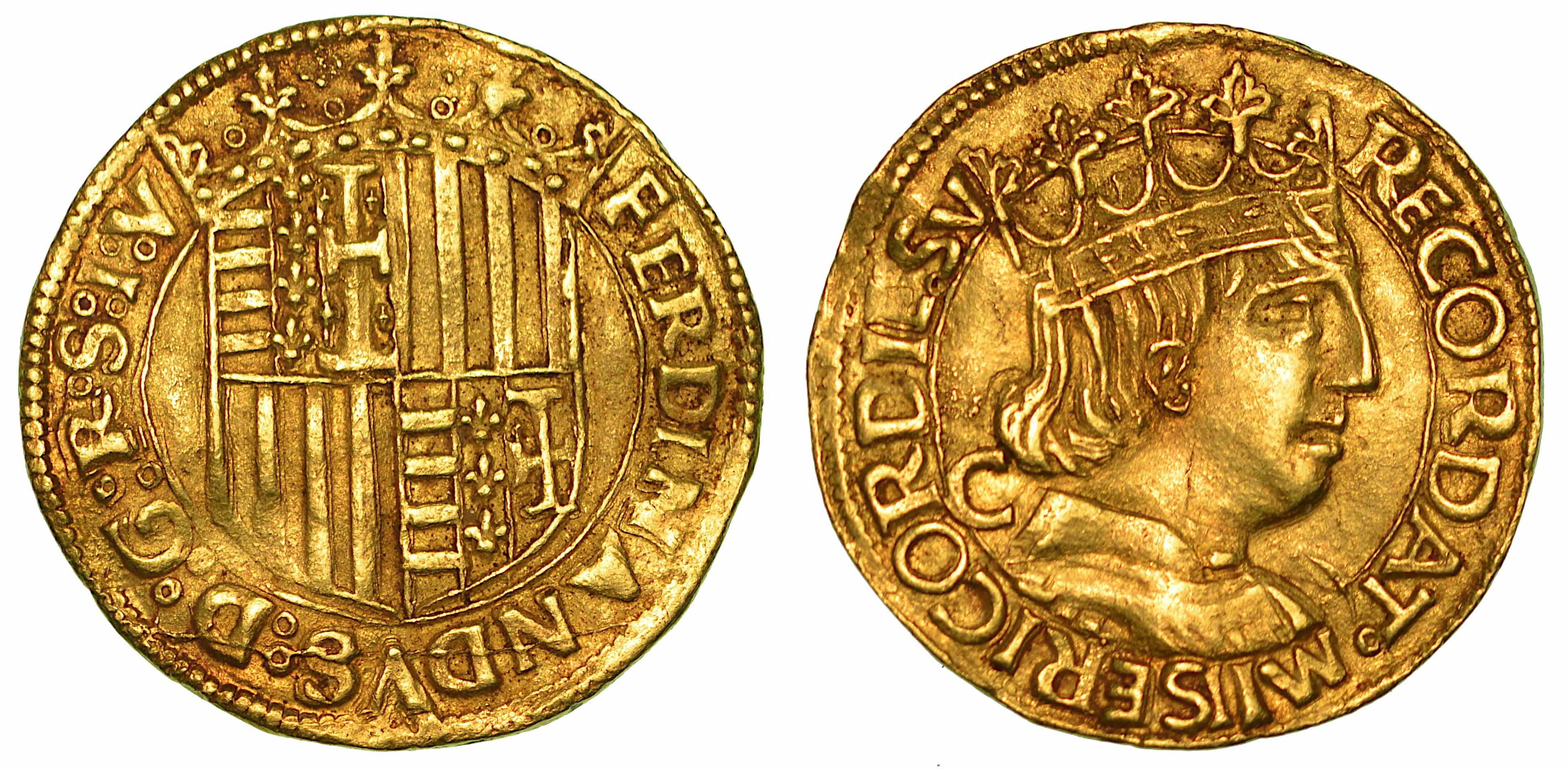 Stemma coronato, inquartato di Napoli al 1° e 4°, d'Aragona al 2° e 3°. R/ Busto adulto, coronato e corazzato a d.; dietro il collo, lettera C. MIR 64/6. Raro. g. 3,49. Diam. mm. 21,85. Oro. Lieve ondulazione nel tondello. BB