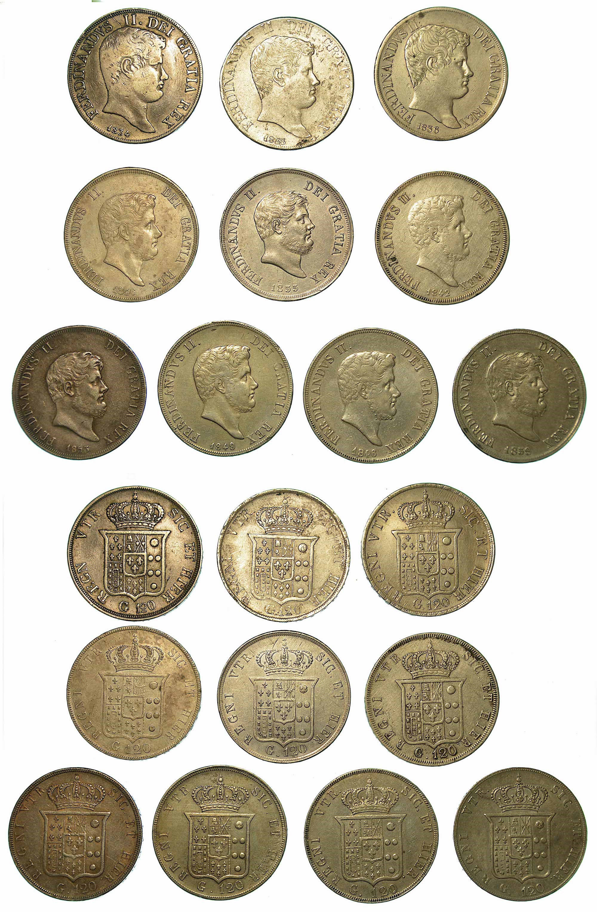 FERDINANDO II DI BORBONE, 1830-1859. Piastra da 120 Grana 1833 - 1834 (variante con REGN in legenda, molto rara: MB/BB) - 1836 - 1842 - 1846 (2 esemplari) - 1849 (rarissima: buon BB) - 1853 - 1855 - 1859. Arg. Conservazioni da MB a BB/SPL.