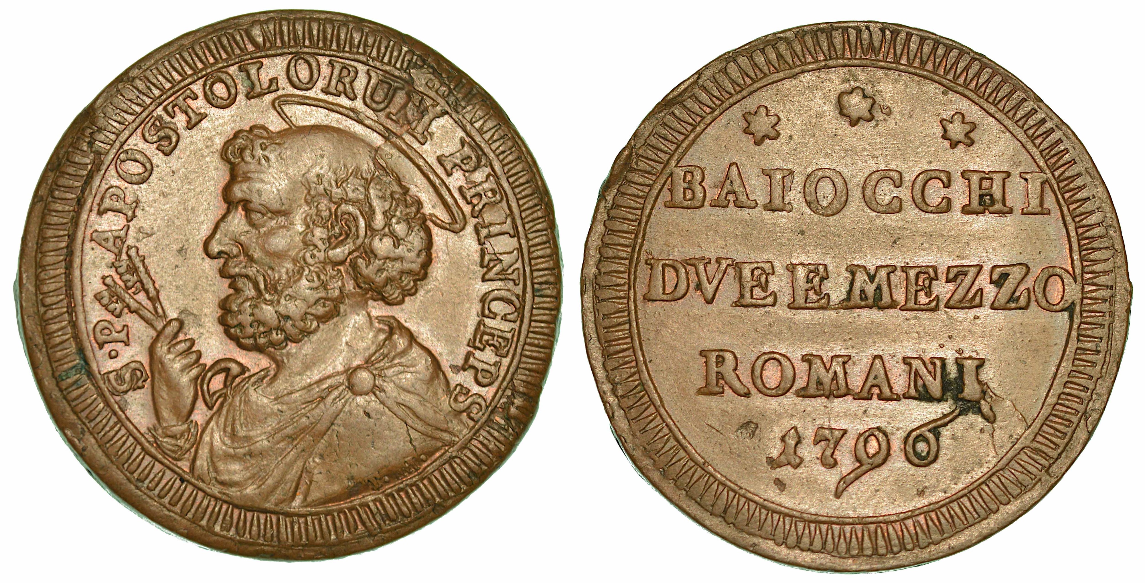 Busto dell'Apostolo Pietro a s. R/ BAIOCCHI / DVE E MEZZO / ROMANI / 1796. Iscrizione disposta su quattro righe. CNI 308. Munt. 100. Raro. g. 18,49. Diam. mm. 30,19. Rame. SPL