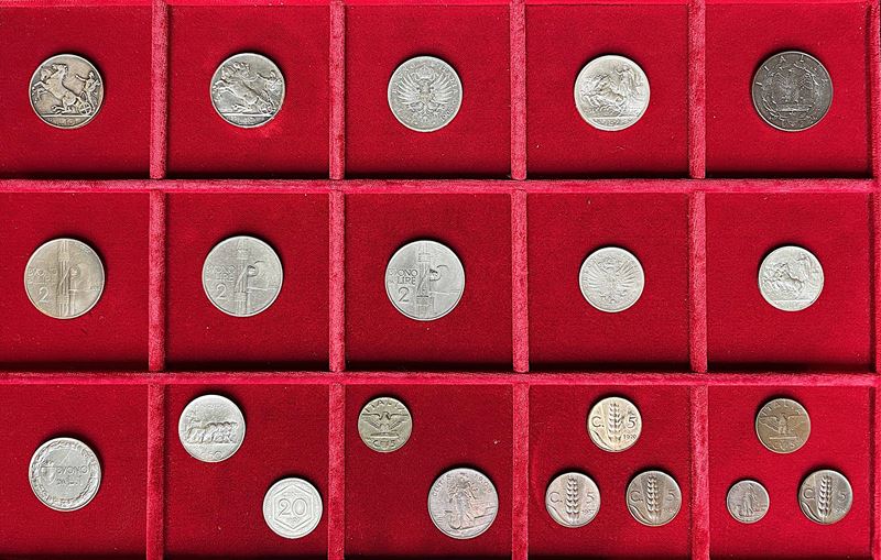 Vittorio Emanuele III di Savoia, 1900-1946. Monetazione comprendente esemplari da: 10, 2 e 1 Lira, 50, 20, 5 e 1 Centesimo. Si segnalano: 2 Lire 1943 (Raro); Buono da 2 Lire 1926 (Raro) - 1927 (Molto raro); 50 Centesimi 1924 (Raro); 5 Centesimi 1908 (Raro) - 1943 (Raro); Centesimo 1911 (Raro). Argento, rame e altri metalli. Conservazioni da MB/BB a q.SPL.